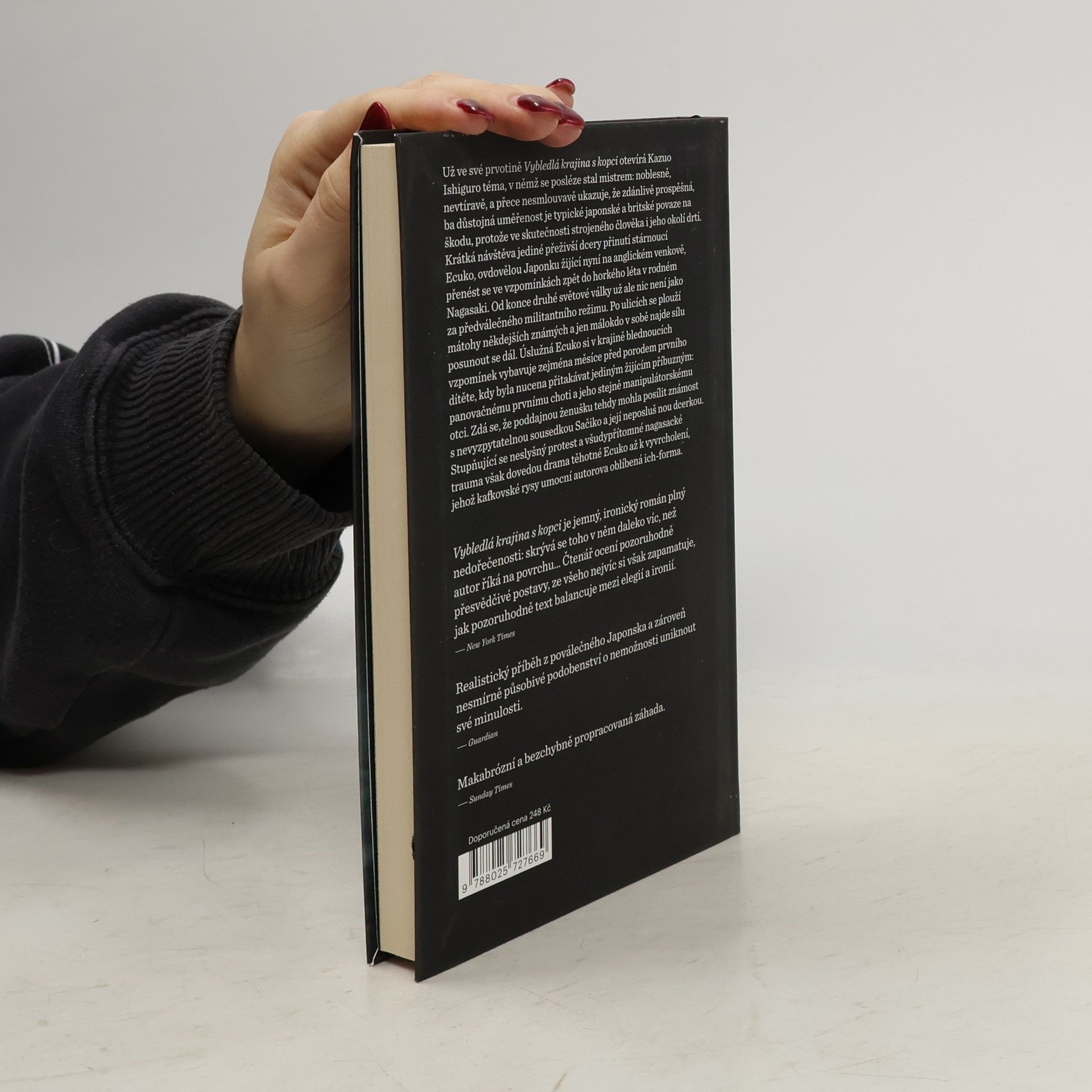 Už v prvotině Vybledlá krajina s kopci držitel Nobelovy ceny za rok 2017 Kazuo Ishiguro noblesně, nevtíravě, a přece nesmlouvavě vykresluje zdánlivě prospěšnou, ba důstojnou uměřenost japonské a britské povahy a zjišťuje, že je jejím nositelům spíše na škodu, protože ve skutečnosti odtažitého člověka i jeho okolí drtí. Krátká návštěva jediné přeživší dcery přinutí stárnoucí Ecuko přenést se ve vzpomínkách zpět do horkého léta v rodném Nagasaki. Na sklonku druhé světové války se tu duše jejích spoluobčanů změnily k nepoznání. Po ulicích se ploužily mátohy někdejších známých a jen málokdo v sobě našel sílu posunout se dál. Ecuko si vybavuje zejména měsíce před porodem prvního dítěte, kdy byla nucena přitakávat jediným žijícím příbuzným: panovačnému prvnímu choti a jeho stejně manipulátorskému otci. Poddajnou ženušku tehdy snad mohla posílit známost s nevyzpytatelnou sousedkou Sačiko a její neposlušnou dcerkou, které chtěly z města vypálených stínů za každou cenu pryč. Stupňující se neslyšný protest a všudypřítomné nagasacké trauma dovedly drama těhotné Ecuko ke kafkovskému vyvrcholení.