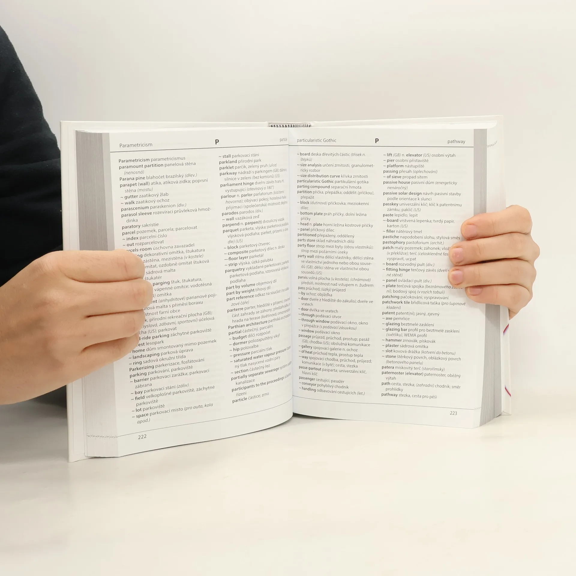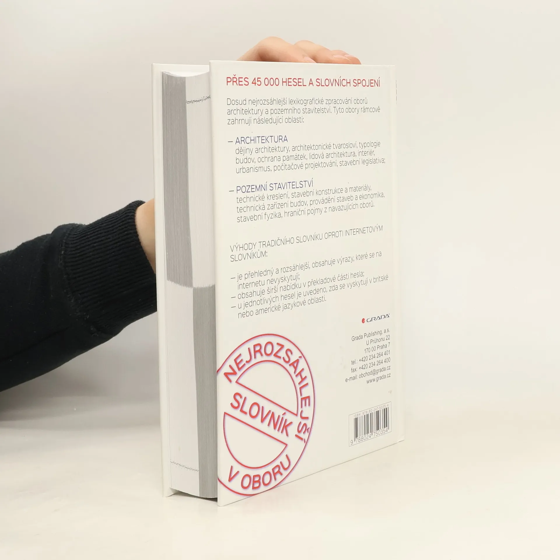 Dosud nejrozsáhlejší lexikografické zpracování oborů architektury a pozemního stavitelství. Tyto obory rámcově zahrnují následující oblasti: - architektura: dějiny architektury, architektonické tvarosloví, typologie budov, ochrana památek, lidová architektura, interiér, urbanismus, počítačové projektování, stavební legislativa; - pozemní stavitelství : technické kreslení, stavební konstrukce a materiály, technická zařízení budov, provádění staveb a ekonomika, stavební fyzika, hraniční pojmy z navazujících oborů. Náš tradiční slovník má oproti internetovým slovníkům následující přednosti: - je přehledný a rozsáhlejší co do objemu terminologie; obsahuje výrazy, které se na internetu nevyskytují (namátkou – strop, izolační vana, žudro, prefa-monolit, hurdiska, kročejový útlum; resp. – dyker, garalow, column band, toed voussoir, cameo window); - obsahuje širší nabídku v překladové části hesla; například u výrazu obývací pokoj je možné - kromě obvyklého living room – vybírat též z family room, sitting room, lounge, great room nebo keeping room (s vysvětlivkami); - u jednotlivých hesel je uvedeno, zda se vyskytují v britské nebo americké jazykové oblasti; - slovník obsahuje převodní tabulky fyzikálních jednotek; - slovník obsahuje seznam odborných zkratek, používaných u institucí, ve výkresech apod.;