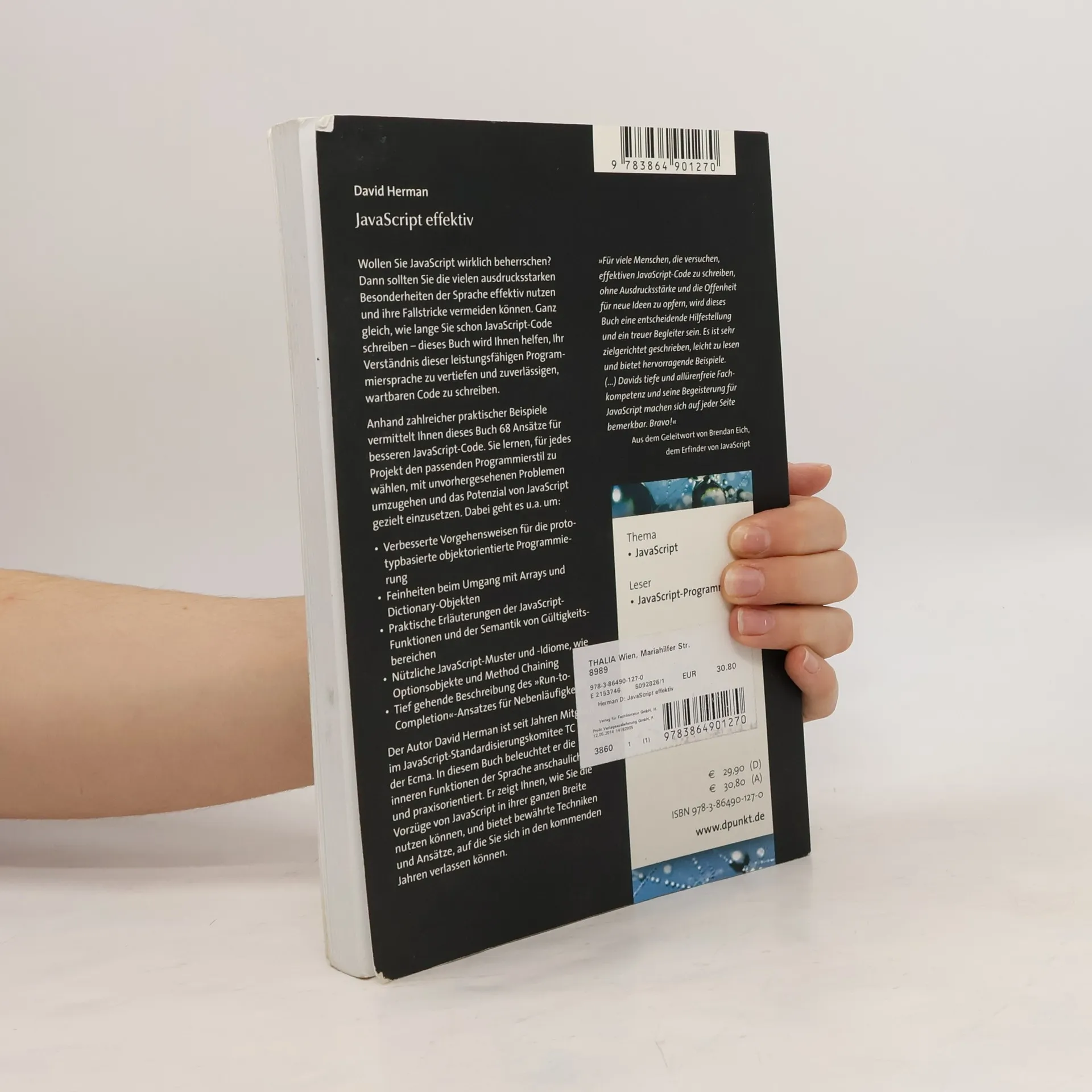 Wollen Sie JavaScript wirklich beherrschen? Dann sollten Sie die Besonderheiten der Sprache effektiv nutzen und ihre Fallstricke vermeiden. Egal, wie lange Sie schon JavaScript-Code schreiben, dieses Buch hilft Ihnen, Ihr Verständnis der Programmiersprache zu vertiefen und wartbaren Code zu erstellen. Anhand praktischer Beispiele vermittelt es 68 Ansätze für besseren JavaScript-Code. Sie lernen, den passenden Programmierstil für jedes Projekt zu wählen, mit unvorhergesehenen Problemen umzugehen und das Potenzial von JavaScript gezielt einzusetzen. Themen sind unter anderem: verbesserte Vorgehensweisen für die prototypbasierte objektorientierte Programmierung, Feinheiten beim Umgang mit Arrays und Dictionary-Objekten, Erläuterungen der JavaScript-Funktionen und der Semantik von Gültigkeitsbereichen, nützliche Muster und Idiome wie Optionsobjekte und Method Chaining sowie eine tiefgehende Beschreibung des „Run-to-Completion“-Ansatzes für Nebenläufigkeit. Der Autor David Herman, Mitglied im JavaScript-Standardisierungskomitee TC 39, beleuchtet die inneren Funktionen der Sprache anschaulich und praxisorientiert. Er zeigt, wie Sie die Vorzüge von JavaScript umfassend nutzen und bewährte Techniken für die Zukunft anwenden können.