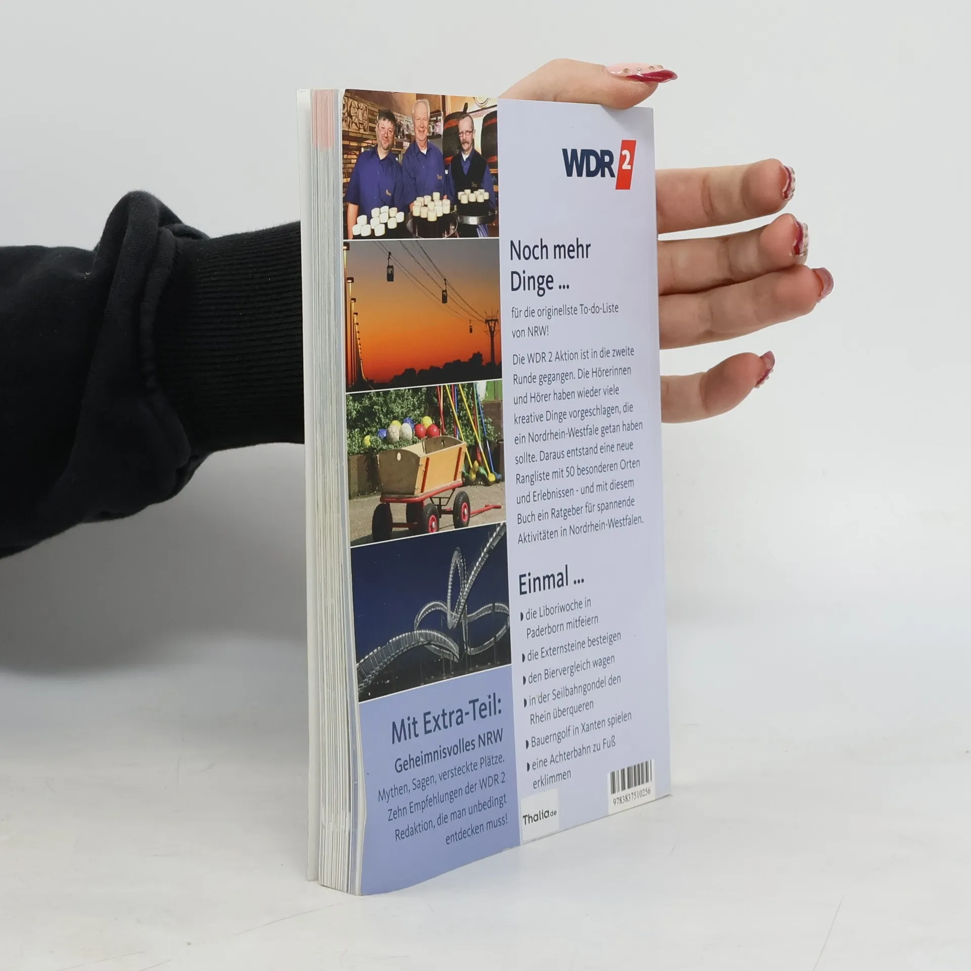 Noch mehr Dinge … für die originellste To-Do-Liste von NRW! Die WDR 2 Aktion ist in die zweite Runde gegangen. Die Hörerinnen und Hörer haben wieder viele kreative Dinge vorgeschlagen, die ein Nordrhein-Westfale getan haben sollte. Daraus entstand eine neue Rangliste mit 50 besonderen Orten und Erlebnissen und mit diesem Buch ein Ratgeber für spannende Aktivitäten in Nordrhein-Westfalen. Einmal … - die Liboriwoche in Paderborn mitfeiern - die Externsteine besteigen - den Biervergleich wagen - in der Seilbahngondel den Rhein überqueren - Bauerngolf in Xanten spielen - eine Achterbahn zu Fuß erklimmen und vieles mehr. Mit Extra-Teil: Geheimnisvolles NRW Mythen, Sagen, versteckte Plätze. Zehn Empfehlungen der WDR 2 Redaktion, die man unbedingt entdecken muss!