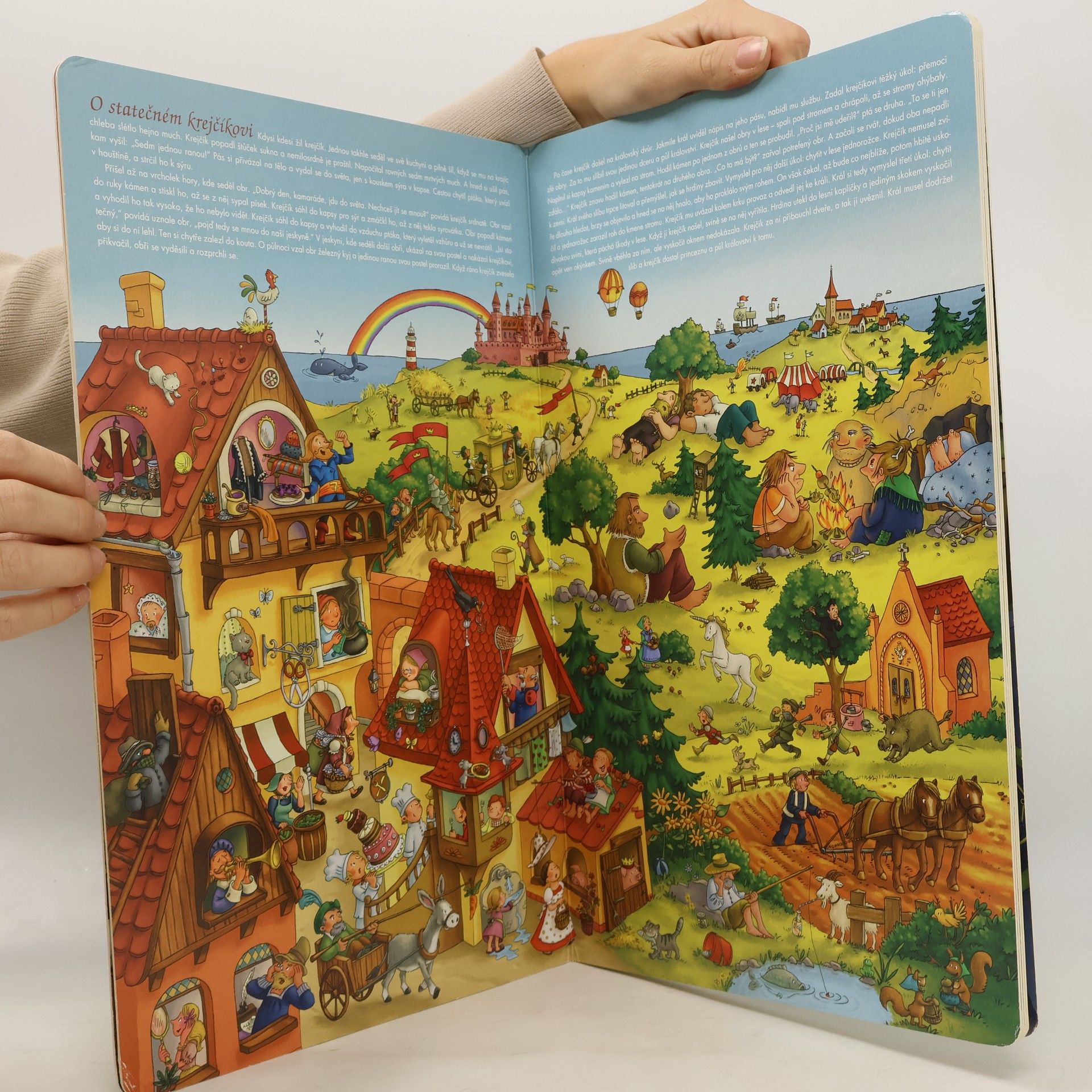 V téhle neobyčejné velkoformátové knize se to jen hemží všemožnými pohádkovými postavičkami! A navíc tu najdete ty nejkrásnější a nejoblíbenější pohádky. O Šípkové Růžence, O statečném krejčíkovi, O perníkové chaloupce, O Červené karkulce, O Popelce, O Sněhurce a sedmi trpaslících - kdo by tyto klasické příběhy neznal? V naší knize si je ale mohou "přečíst" i ti, kdo ještě doopravdy číst ani neumějí… Protože obrázkům, těm určitě rozumí každý! Kromě napínavých dobrodružství hlavních hrdinů tu lze objevit také spoustu drobných příhod dalších pohádkových postav, tvorů a netvorů. Stačí jen otevřít knihu, ponořit se do pohádkového světa a začít ho objevovat. Tak hurá do toho! Pomůžete princi najít ve spícím zámku se spoustou komnat a tajemných zákoutí spanilou Růženku? A dokážete podle obrázků převyprávět všechny udatné činy statečného krejčíka? Nebudete se bát v tajemném nočním lese, kde ježibaba v perníkové chaloupce vězní Jeníčka a Mařenku? A co takhle v chaloupce u lesa, kam se vydáte s Červenou karkulkou? Nenechte se zmást všemi těmi dovádějícími a rozesmátými zvířátky, kterých je plný kraj, a dávejte pozor, koho najdete v babiččině posteli! Ostražitost bude třeba i u sedmi trpaslíků - na Sněhurku má totiž spadeno zlá macecha a usiluje jí o život. Ještě že v pohádkách vždycky dobro zvítězí nad zlem! O tom by mohla vyprávět i Popelka - nebo to raději zkusíte vy, malí čtenáři?