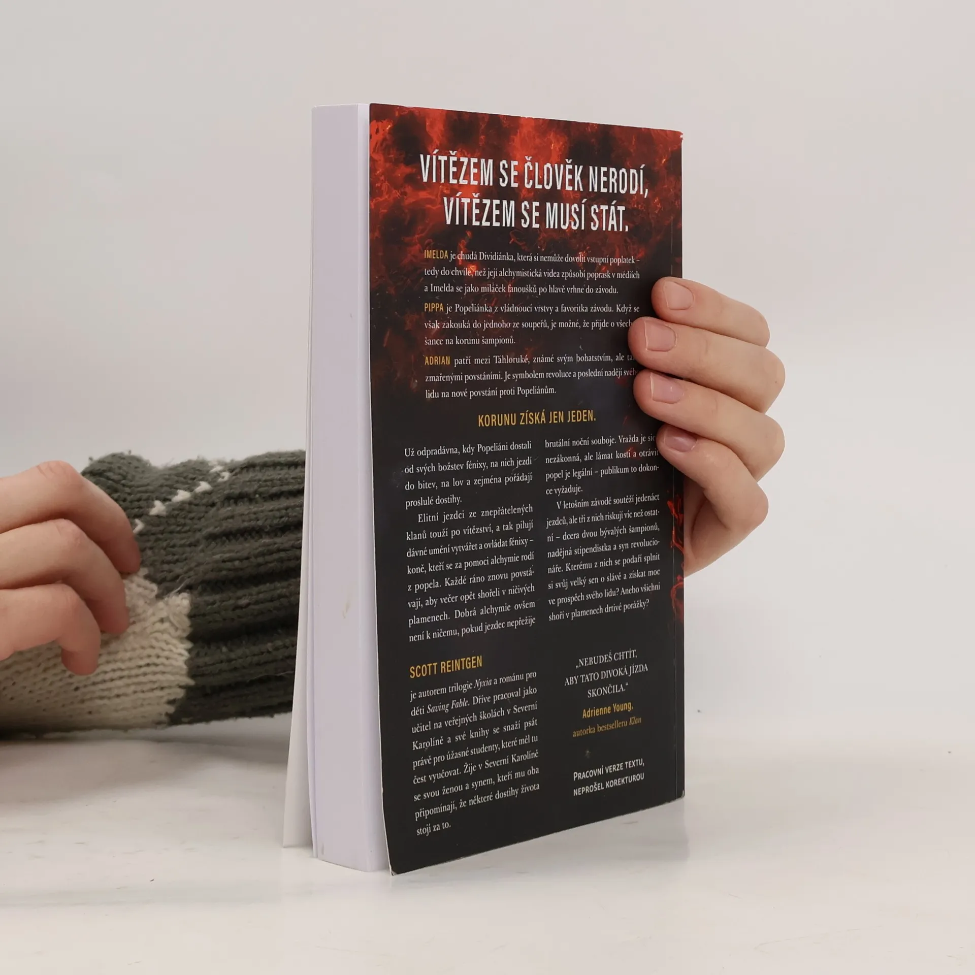 Už odedávna, kdy Popeliáni dostali od svých božstev fénixy, na nich jezdí do bitev, na lov a zejména na proslulém Dostihu. Elitní jezdci ze znepřátelených kultur touží po vítězství, a tak pilují dávné umění vytvářet a ovládat fénixy – koně, kteří se za pomoci alchymie rodí z popela. Každé ráno znovu povstávají, aby večer opět shořeli v ničivých plamenech. Dobrá alchymie ovšem není k ničemu, pokud jezdec nepřežije brutální noční souboje. Vražda je sice nezákonná, ale lámat kosti a otrávit popel je legální – publikum to dokonce vyžaduje. V letošním závodě soutěží jedenáct jezdců, ale tři z nich riskují víc než ostatní – dcera dvou bývalých šampionů, nadějná stipendistka a syn revolucionáře. Kterému z nich se podaří splnit si svůj velký sen o slávě a získat moc ve prospěch svého lidu? Anebo všichni shoří v drtivé porážce? VÍTĚZEM SE ČLOVĚK NERODÍ, VÍTĚZEM SE MUSÍ STÁT. IMELDA je chudá Dividiánka, která si nemůže dovolit vstupní poplatek – tedy do chvíle, než její alchymistická videa způsobí poprask v médiích a Imelda se jako miláček fanoušků po hlavě vrhne do závodu. PIPPA je Popeliánka z vládnoucí vrstvy a favoritka závodu. Když se však zakouká do jednoho ze soupeřů, je možné, že přijde o všechny šance na korunu šampionů. ADRIAN patří mezi Táhloruké, známé svým bohatstvím, ale také zmařenými povstáními. Je symbolem revoluce a poslední nadějí svého lidu na nové povstání proti Popeliánům. KORUNU ZÍSKÁ JEN JEDEN.