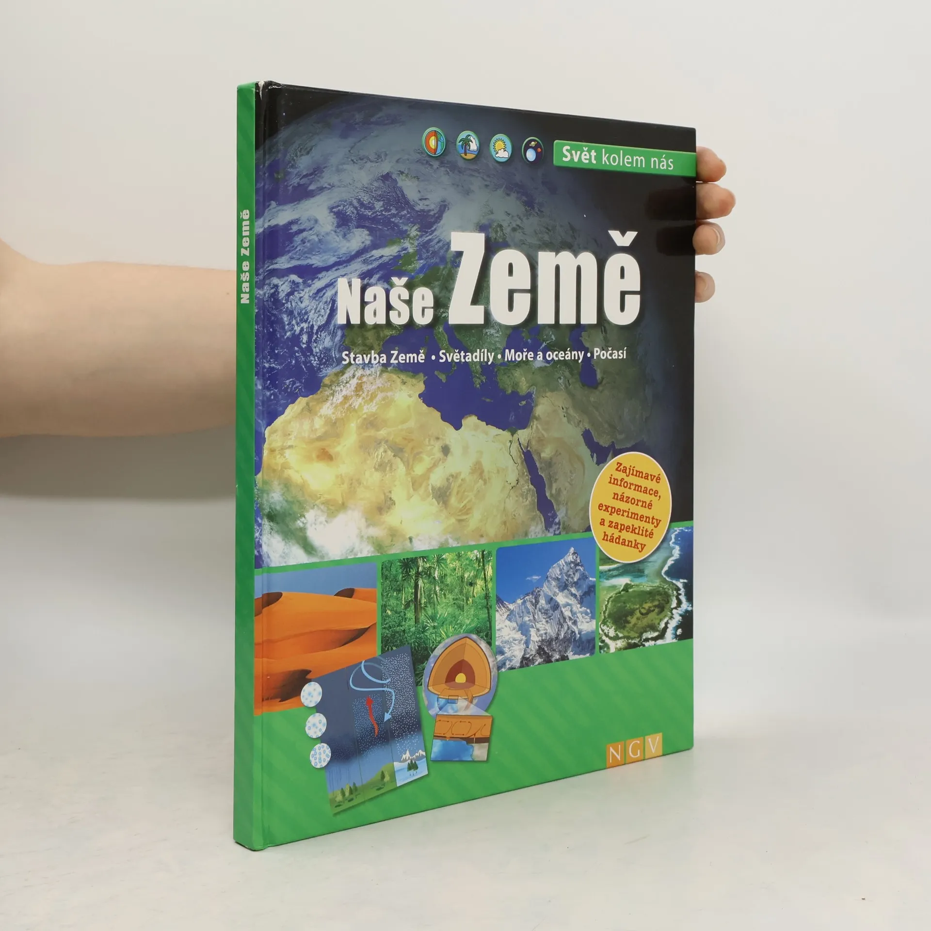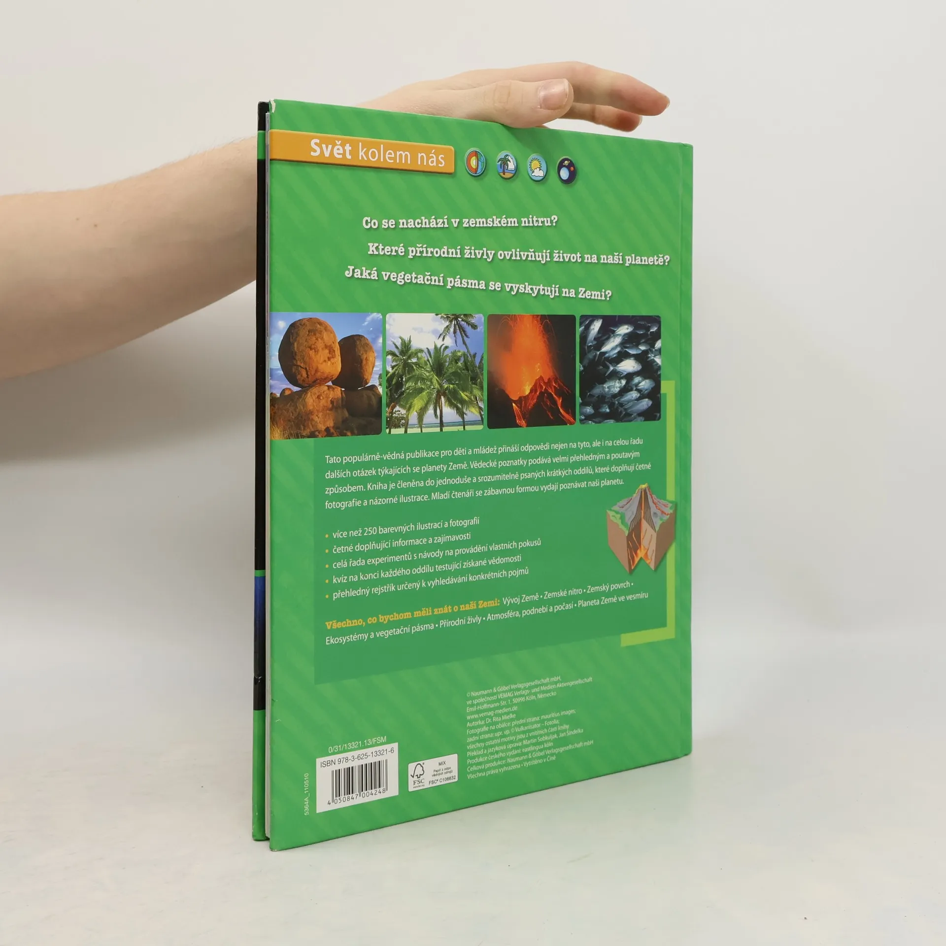 Co se nachází v zemském nitru? Které přírodní živly ovlivňují život na naší planetě? Jaká vegetační pásma se vyskytují na Zemi? Naše Země / svět kolem nás je encyklopedií pro děti a mládež a přináší odpovědi na tyto, ale i na celou řadu dalších otázek týkajících se planety Země. Vědecké poznatky podává velmi přehledným a poutavým způsobem. Je členěna do jednoduše a srozumitelně psaných krátkých oddílů, které doplňuje více než 250 barevných ilustrací a fotografií. Kromě četných informací a zajímavostí v ní najdete i celou řadu experimentů s návody na provádění vlastních pokusů. V kvízu na konci každého oddílu si můžete otestovat získané vědomosti. Vydejte se poznat naši planetu! (Stavba Země. Světadíly. Moře a oceány. Počasí)