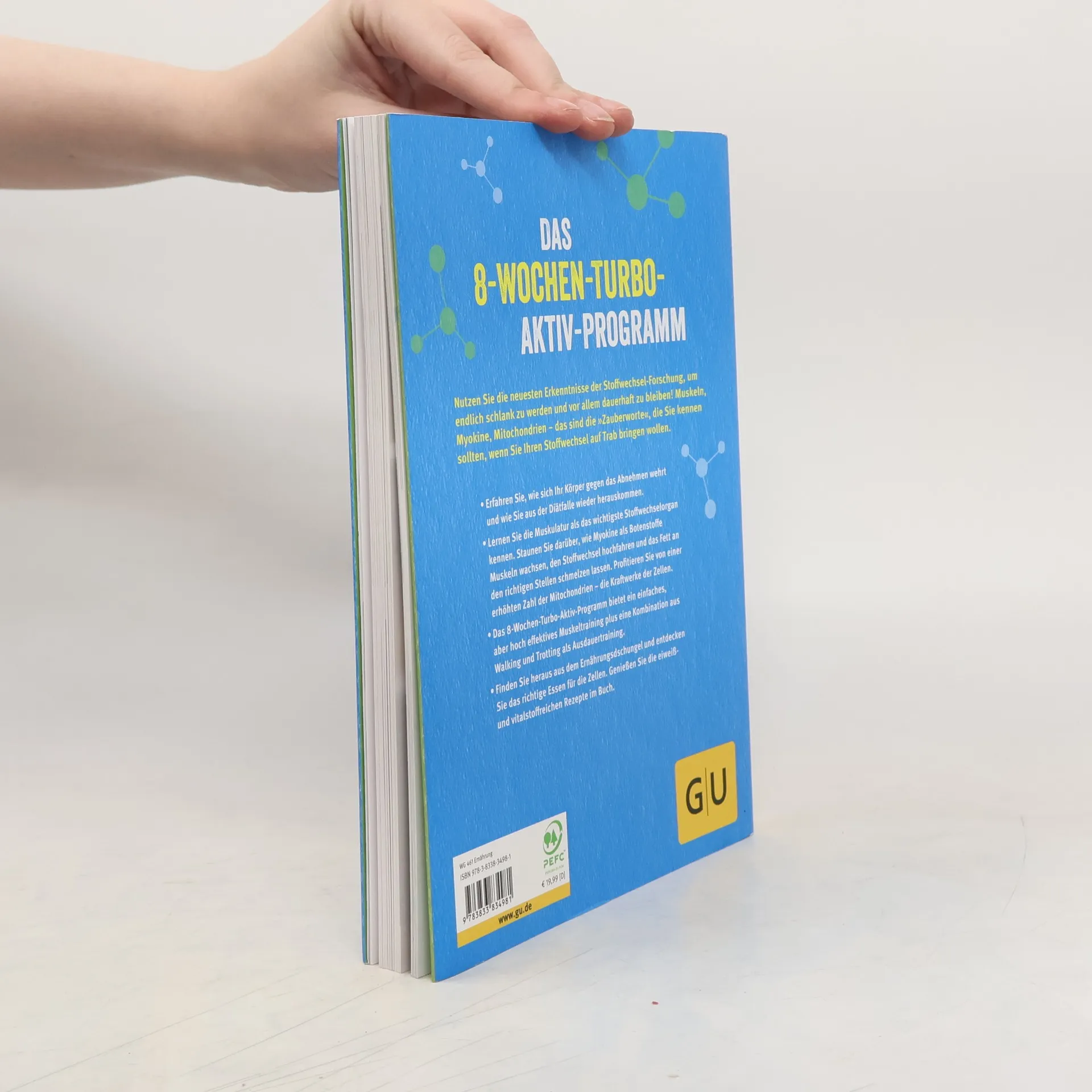 Nutzen Sie die Erkenntnisse der Stoffwechsel-Forschung, um schlank zu werden und dauerhaft zu bleiben. Mit gezieltem Muskeltraining wird der Turbo gezündet! Myokine, hormonähnliche Botenstoffe, unterstützen die Fettverbrennung, insbesondere an Problemzonen. Das abwechslungsreiche 8-Wochen-Turbo-Aktiv-Programm setzt dies effektiv um. Die Übungen sind so gestaltet, dass auch Übergewichtige und Ungeübte leicht einsteigen können. Ein begleitendes Ernährungsprogramm rundet das Konzept ab und bietet eine Lösung für alle, die trotz zahlreicher Diäten nicht abnehmen konnten, da diese den Stoffwechsel aus dem Takt gebracht haben. Der entscheidende Unterschied zu herkömmlichen Diäten: Um erfolgreich und nachhaltig abzunehmen, sollten Sie mit Ihrem Körper arbeiten, nicht gegen ihn. Diäten senken den Stoffwechsel und reduzieren wichtige Muskelmasse. Der Körper kann überflüssige Pfunde selbst abwerfen, wenn der Stoffwechsel richtig angeregt wird. Regelmäßige Bewegung und eine auf den Biorhythmus abgestimmte Ernährung fördern die Fettverbrennung. Die Kombination aus Ausdauer- und Krafttraining erhöht den Grundumsatz, sodass der Körper effektiv Fett verbrennt. Bringen Sie Ihren Körper in nur acht Wochen auf Hochtouren!