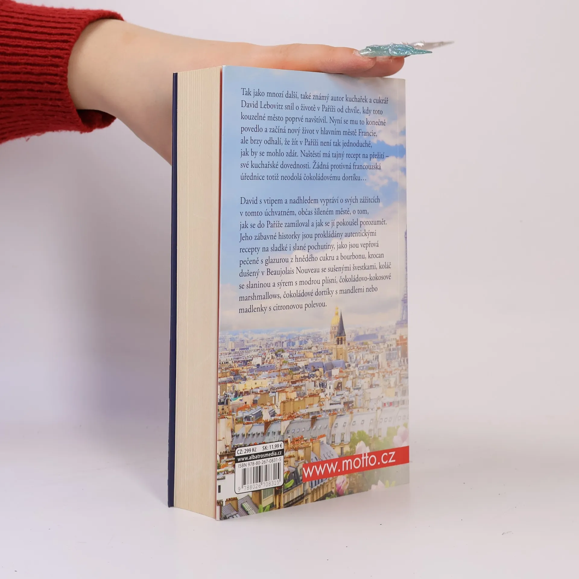 Tak jako mnozí další, známý autor kuchařek a cukrář David Lebovitz snil o životě v Paříži od chvíle, kdy toto kouzelné město poprvé navštívil. Nyní se mu to konečně povedlo a začíná nový život v hlavním městě Francie, ale brzy odhalí, že žít v Paříži není tak jednoduché, jak by se mohlo zdát. Naštěstí má tajný recept na přežití – své kuchařské dovednosti. Žádný protivný francouzský úředník totiž neodolá čokoládovému dortíku… David s vtipem a nadhledem vypráví o svých zážitcích v tomto úchvatném, občas šíleném městě, o tom, jak se do Paříže zamiloval a jak se jí pokoušel porozumět. Jeho zábavné historky jsou prokládány autentickými recepty na sladké i slané pochutiny, jako jsou vepřová pečeně s glazurou z hnědého cukru a bourbonu, krocan dušený v Beaujolais Nouveau se sušenými švestkami, koláč se slaninou a sýrem s modrou plísní, čokoládovo-kokosové marshmallows, čokoládové dortíky s mandlemi nebo madlenky s citronovou polevou.