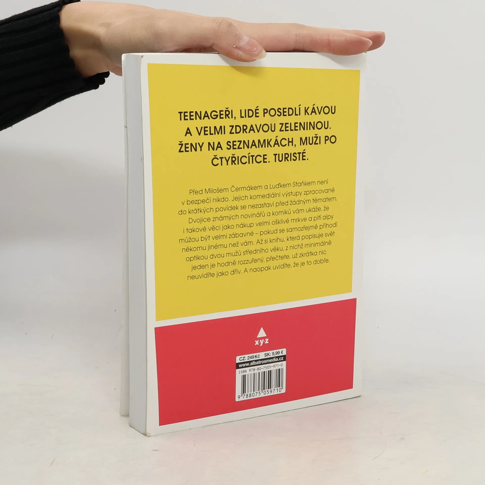 Teenageři, lidé posedlí kávou a velmi zdravou zeleninou. Ženy na seznamkách, muži po čtyřicítce. Turisté. Před Milošem Čermákem a Luďkem Staňkem není v bezpečí nikdo. Jejich komediální výstupy zpracované do krátkých povídek se nezastaví před žádným tématem. Dvojice známých novinářů a komiků vám ukáže, že i takové věci jako nákup velmi ošklivé mrkve a pití alpy můžou být velmi zábavné – pokud se samozřejmě přihodí někomu jinému než vám. Až si knihu, která popisuje svět optikou dvou mužů středního věku, z nichž minimálně jeden je hodně rozzuřený, přečtete, už zkrátka nic neuvidíte jako dřív. A naopak uvidíte, že je to dobře.