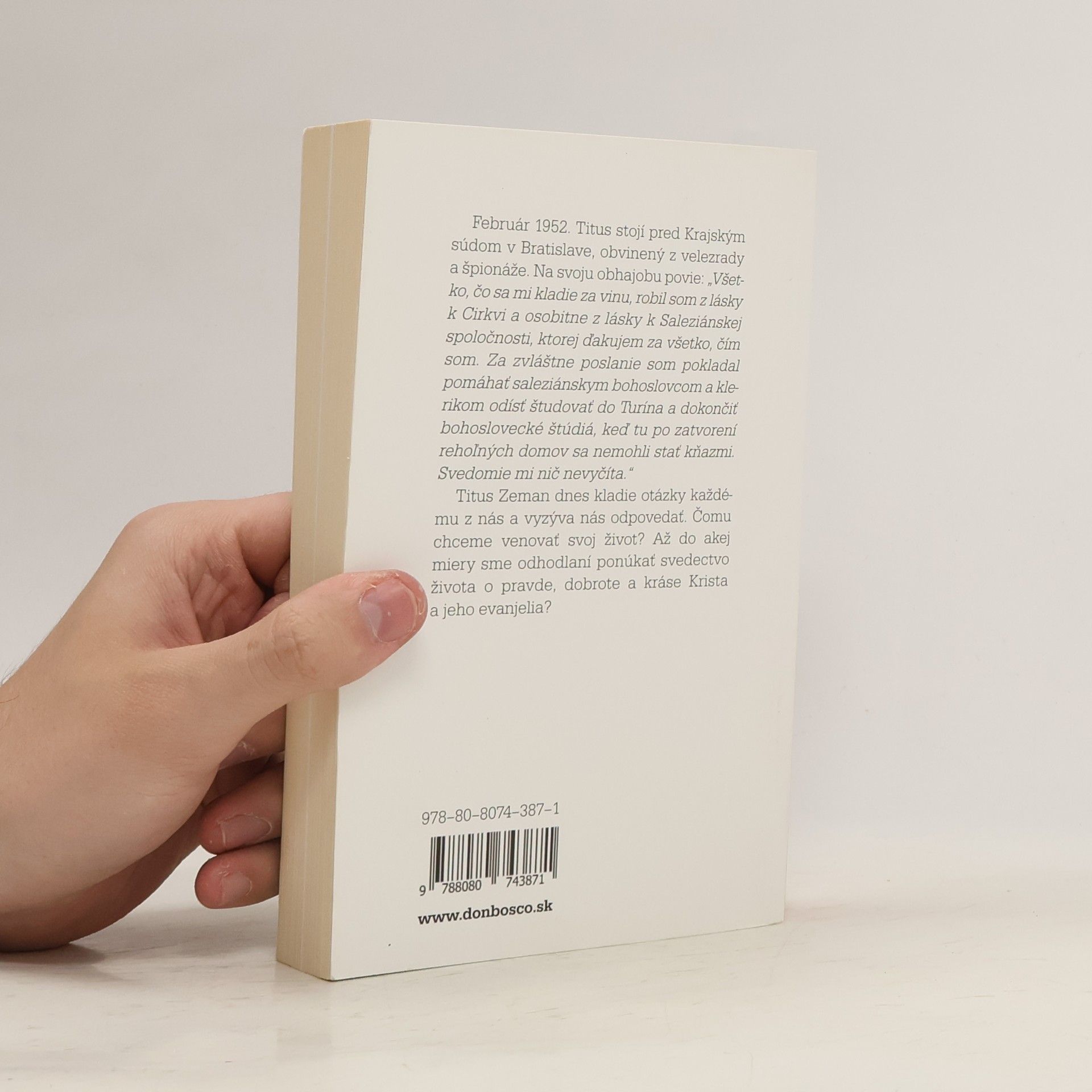 Oficiálny životopis blahoslaveného Február 1952. Titus stojí pred Krajským súdom v Bratislave, obvinený z velezrady a špionáže. Na svoju obhajobu povie: „Všetko, čo sa mi kladie za vinu, robil som z lásky k Cirkvi a osobitne z lásky k Saleziánskej spoločnosti, ktorej ďakujem za všetko, čím som. Za zvláštne poslanie som pokladal pomáhať saleziánskym bohoslovcom a klerikom odísť študovať do Turína a dokončiť bohoslovecké štúdiá, keď tu po zatvorení rehoľných domov sa nemohli stať kňazmi. Svedomie mi nič nevyčíta.“ Titus Zeman dnes kladie otázky každému z nás a vyzýva nás odpovedať. Čomu chceme venovať svoj život? Až do akej miery sme odhodlaní ponúkať svedectvo života o pravde, dobrote a kráse Krista a jeho evanjelia? Kniha je obohatená o obrazovú prílohu zo života Titusa Zemana.