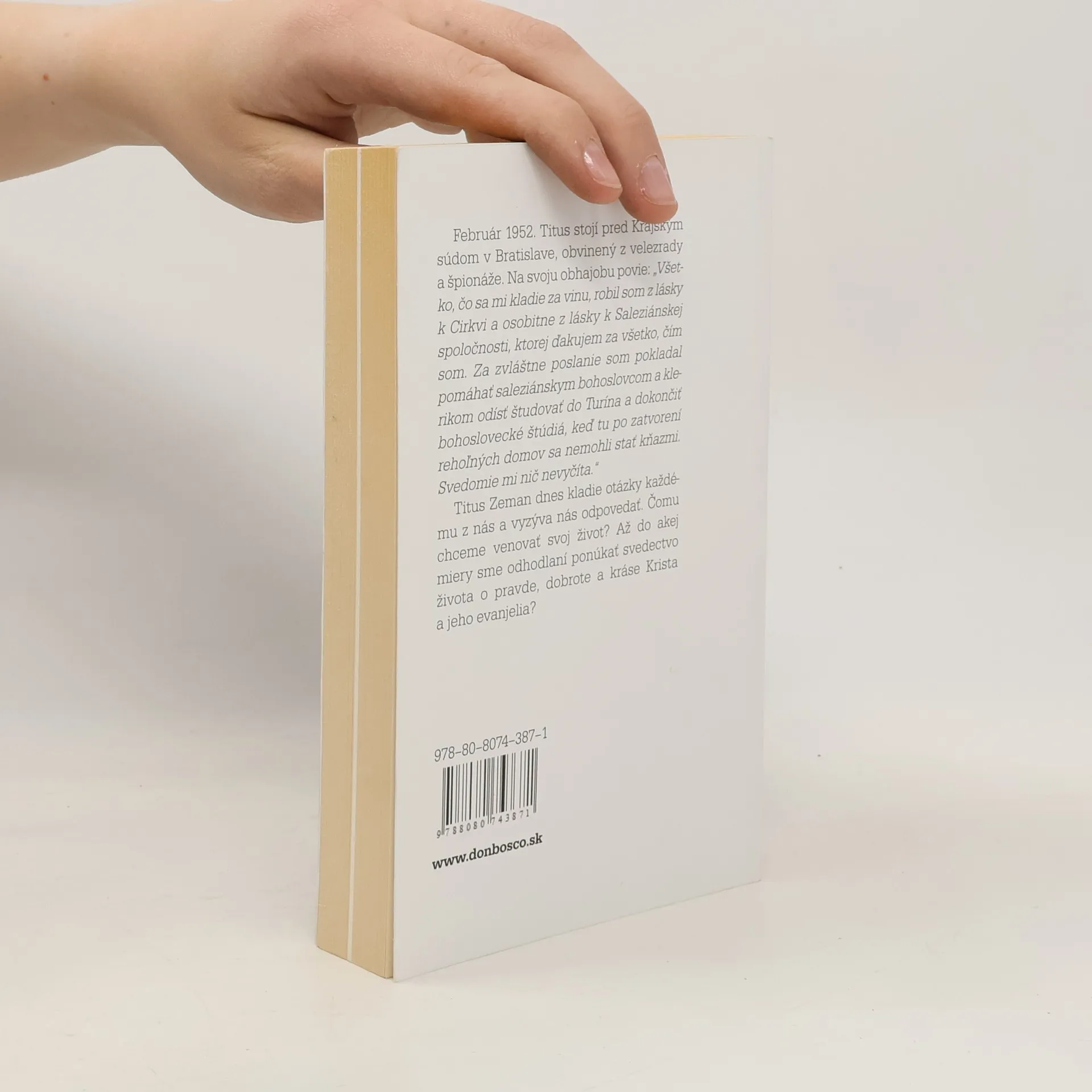 Oficiálny životopis blahoslaveného Február 1952. Titus stojí pred Krajským súdom v Bratislave, obvinený z velezrady a špionáže. Na svoju obhajobu povie: „Všetko, čo sa mi kladie za vinu, robil som z lásky k Cirkvi a osobitne z lásky k Saleziánskej spoločnosti, ktorej ďakujem za všetko, čím som. Za zvláštne poslanie som pokladal pomáhať saleziánskym bohoslovcom a klerikom odísť študovať do Turína a dokončiť bohoslovecké štúdiá, keď tu po zatvorení rehoľných domov sa nemohli stať kňazmi. Svedomie mi nič nevyčíta.“ Titus Zeman dnes kladie otázky každému z nás a vyzýva nás odpovedať. Čomu chceme venovať svoj život? Až do akej miery sme odhodlaní ponúkať svedectvo života o pravde, dobrote a kráse Krista a jeho evanjelia? Kniha je obohatená o obrazovú prílohu zo života Titusa Zemana.