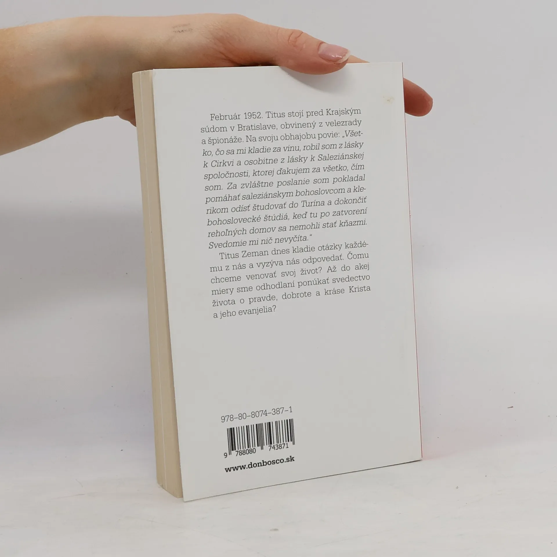 Oficiálny životopis blahoslaveného Február 1952. Titus stojí pred Krajským súdom v Bratislave, obvinený z velezrady a špionáže. Na svoju obhajobu povie: „Všetko, čo sa mi kladie za vinu, robil som z lásky k Cirkvi a osobitne z lásky k Saleziánskej spoločnosti, ktorej ďakujem za všetko, čím som. Za zvláštne poslanie som pokladal pomáhať saleziánskym bohoslovcom a klerikom odísť študovať do Turína a dokončiť bohoslovecké štúdiá, keď tu po zatvorení rehoľných domov sa nemohli stať kňazmi. Svedomie mi nič nevyčíta.“ Titus Zeman dnes kladie otázky každému z nás a vyzýva nás odpovedať. Čomu chceme venovať svoj život? Až do akej miery sme odhodlaní ponúkať svedectvo života o pravde, dobrote a kráse Krista a jeho evanjelia? Kniha je obohatená o obrazovú prílohu zo života Titusa Zemana.