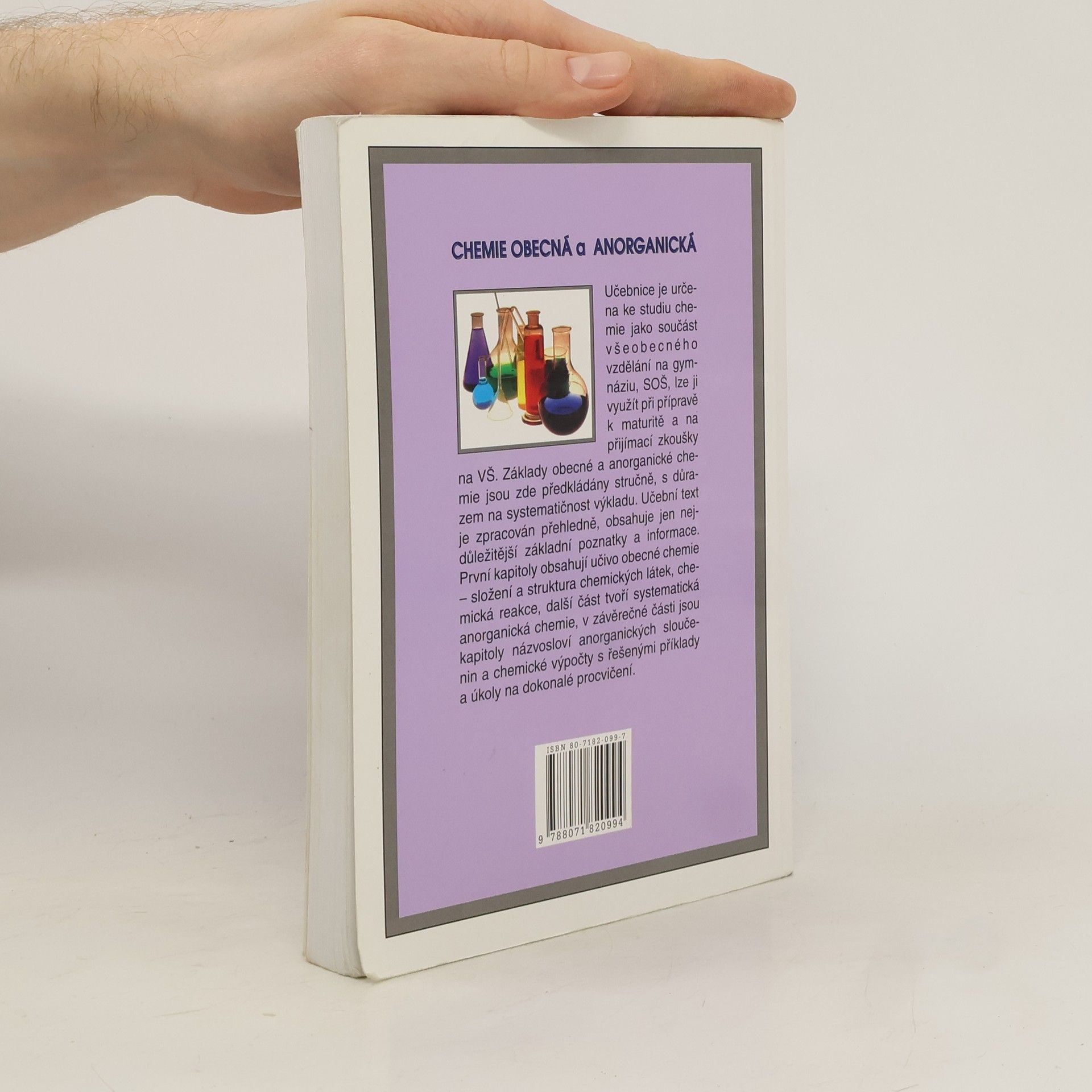 Základy obecné a anorganické chemie jsou předkládány stručně, s důrazem na systematičnost výkladu. Učební text jednotlivých kapitol je ukončen kontrolními otázkami k procvičení učiva. Užitý styl výkladu vychází z pedagogické praxe, obsahuje jen nejdůležitější základní poznatky a podstatná fakta. Učebnice je určena ke studiu chemie na gymnáziích, středních odborných školách, lze ji použít při přípravě k maturitě a na přijímací zkoušky z chemie na VŠ (obory chemické, biologické, ekologické, lékařství atd.).