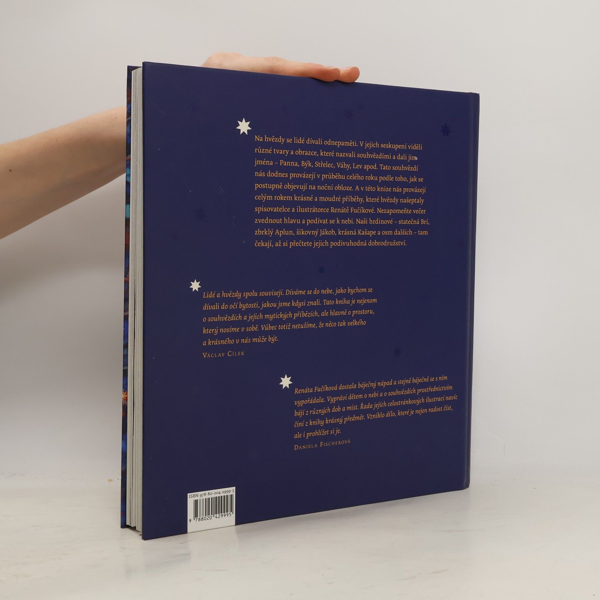 Odnepaměti lidé pozorují hvězdy, seskupují je v souhvězdí, dávají jim jména a vymýšlejí si k nim příběhy. Stejně si v této knize vymýšlejí příběhy i rodiče malého Jakuba, aby mu pomohli rozhodovat se v životě správně. Spisovatelka a ilustrátorka Renáta Fučíková se inspirovala kulturami z celého světa, aby vytvořila zcela novou mytologii vážící se ke dvanácti znamením zvěrokruhu. Každý příběh si vás ihned získá svou magickou atmosférou, krásným jazykem plným barev, chutí i vůní, a nádhernými ilustracemi. A všechny příběhy dohromady ukazují, že jakkoli časově či zeměpisně jsou od sebe lidé vzdáleni, prožívají stále stejné radosti i starosti. Nezapomeňte večer zvednout hlavu a podívat se k nebi. Naši hrdinové – statečná Brí, zbrklý Aplun, šikovný Jákob, krásná Kašape a osm dalších – tam čekají, až si přečtete jejich podivuhodná dobrodružství.
