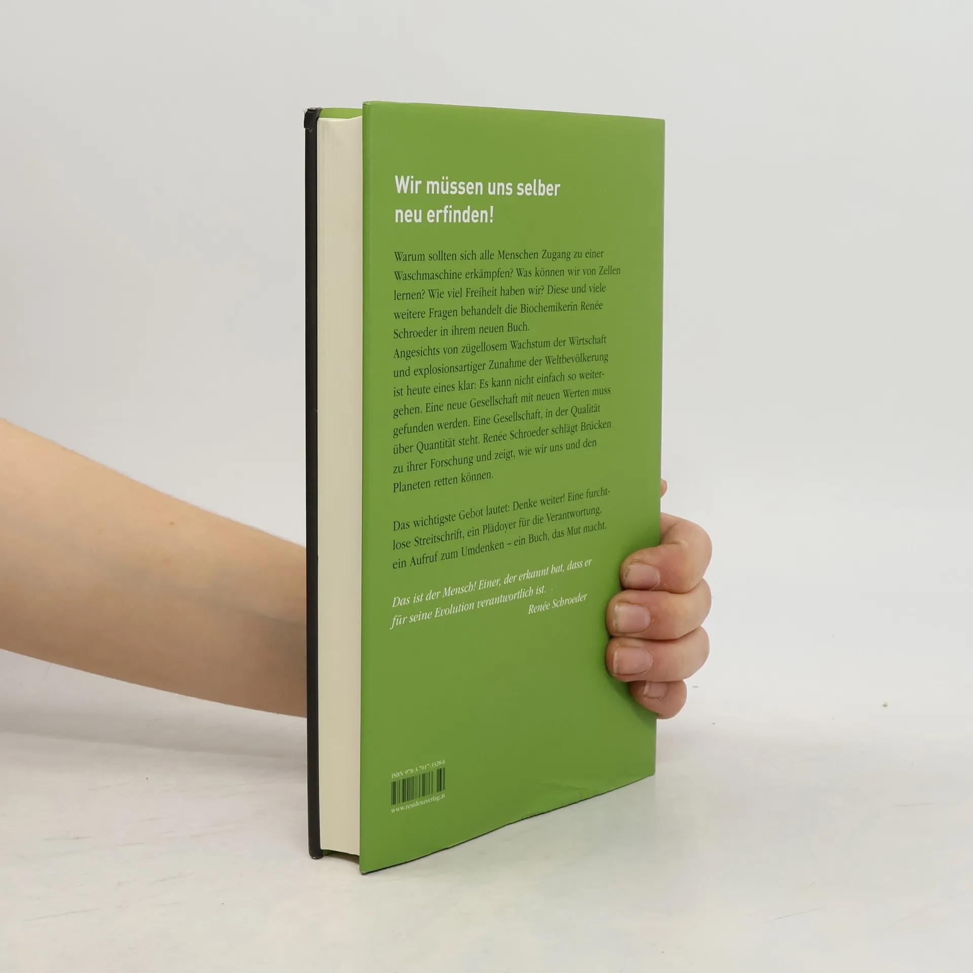 Wir müssen uns selber neu erfinden! Die Biochemikerin Renée Schroeder lernt von Zellen und Bakterien, wo es kontrolliertes Wachstum und selbstloses Verhalten gibt. Denn angesichts von zügellosem Wirtschaftswachstum und explosionsartiger Zunahme der Weltbevölkerung ist heute eines klar: So kann es nicht weitergehen. Eine neue Gesellschaft mit neuen Werten muss gefunden werden, in der Qualität über Quantität steht. Renée Schroeder schlägt Brücken zu ihrer Forschung und zeigt auf, wie wir uns und den Planeten retten können. Das wichtigste Gebot aber lautet: Denke weiter! Eine furchtlose Streitschrift, ein Plädoyer für die Verantwortung, ein Aufruf zum Umdenken – ein Buch, das Mut macht.