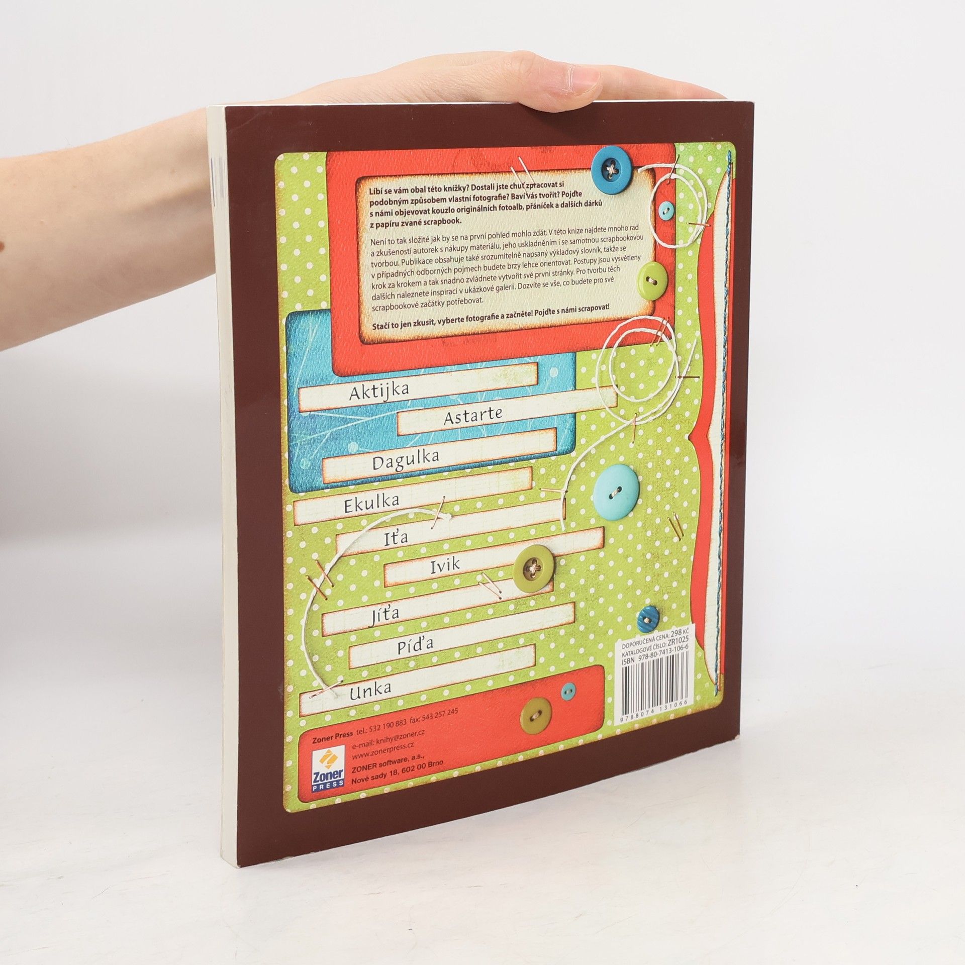 První podrobná kniha na českém trhu o scrapbooku, který si získává stále větší popularitu. Scrapbook je spousta času stráveného nad fotkami, papíry a ozdobami, které vedou k jedinečným fotoalbům, jež obdivujete všude, kde je ukážete. Umožňuje vám vytvořit rodinná alba plná vzpomínek a historek, které chcete uchovat. Cestovní deníky a alba z dovolené odrážejí náladu míst nejen fotkami, ale i zdobením stránek. Scrapbook vás motivuje procházet staré fotografie a vzpomínky, přičemž obsahuje vzpomínky na samotné snímky a na proces tvoření. Je to dobrý pocit, že vytváříte něco trvalého, co vás odmění od každodenních starostí. Taktéž přináší možnost setkat se s lidmi se stejným zájmem, sdílet zkušenosti a účastnit se soutěží. Prakticky to funguje tak, že si vyberete fotografie k určitému tématu, doplníte je o další papíry a ozdoby, napíšete popisky a vytvoříte nadpis. Kromě fotoalb můžete tvořit i originální přáníčka, obrázky, diplomy či dekorativní předměty, které obohatí vaše dárky. Pokud vás baví tvořit, objevte kouzlo scrapbooku. Kniha nabízí rady k nákupům, uskladnění materiálu a postupy „krok za krokem“, které vám pomohou zvládnout první stránky a inspirovat se v ukázkové galerii. Dozvíte se vše potřebné pro vaše scrapbookové začátky.