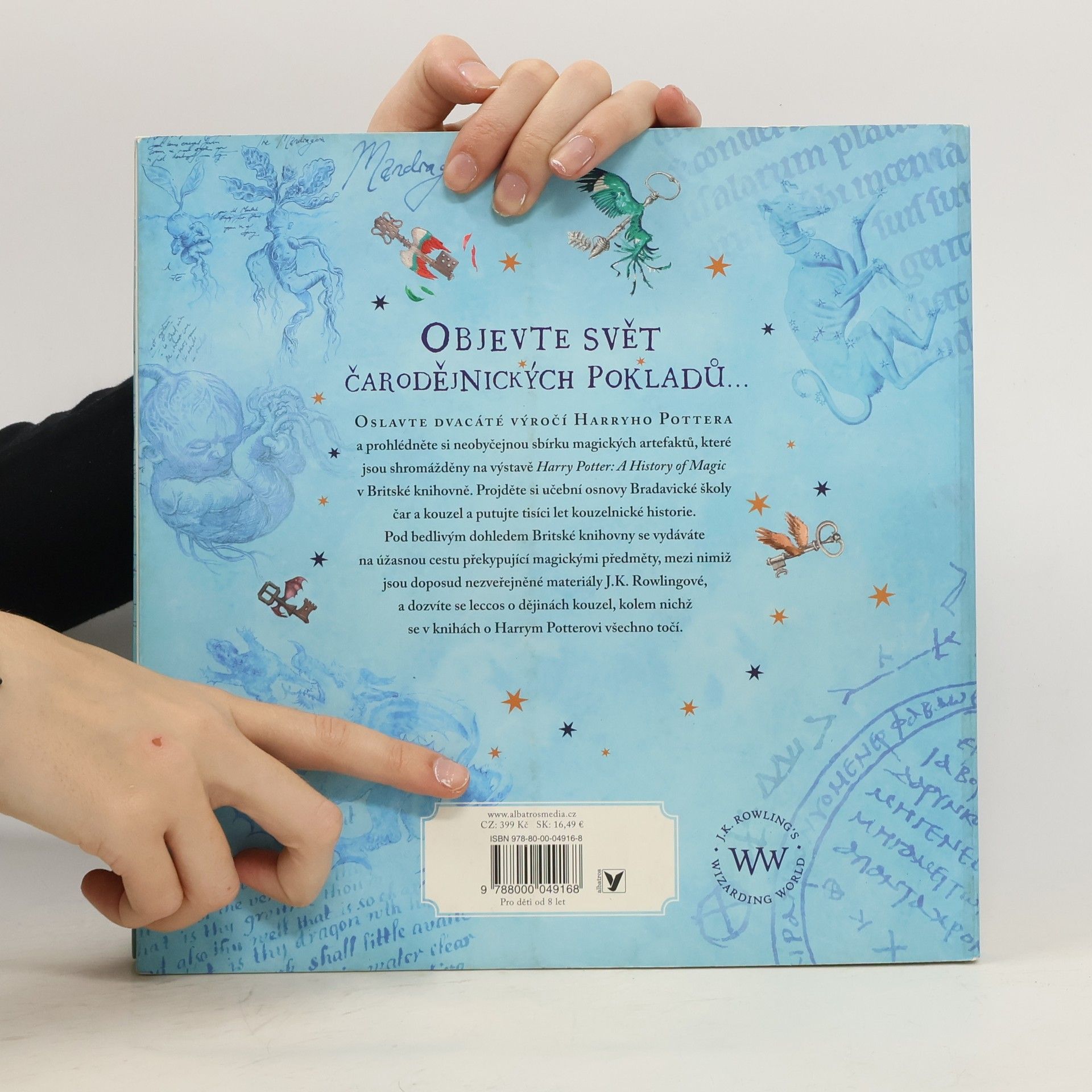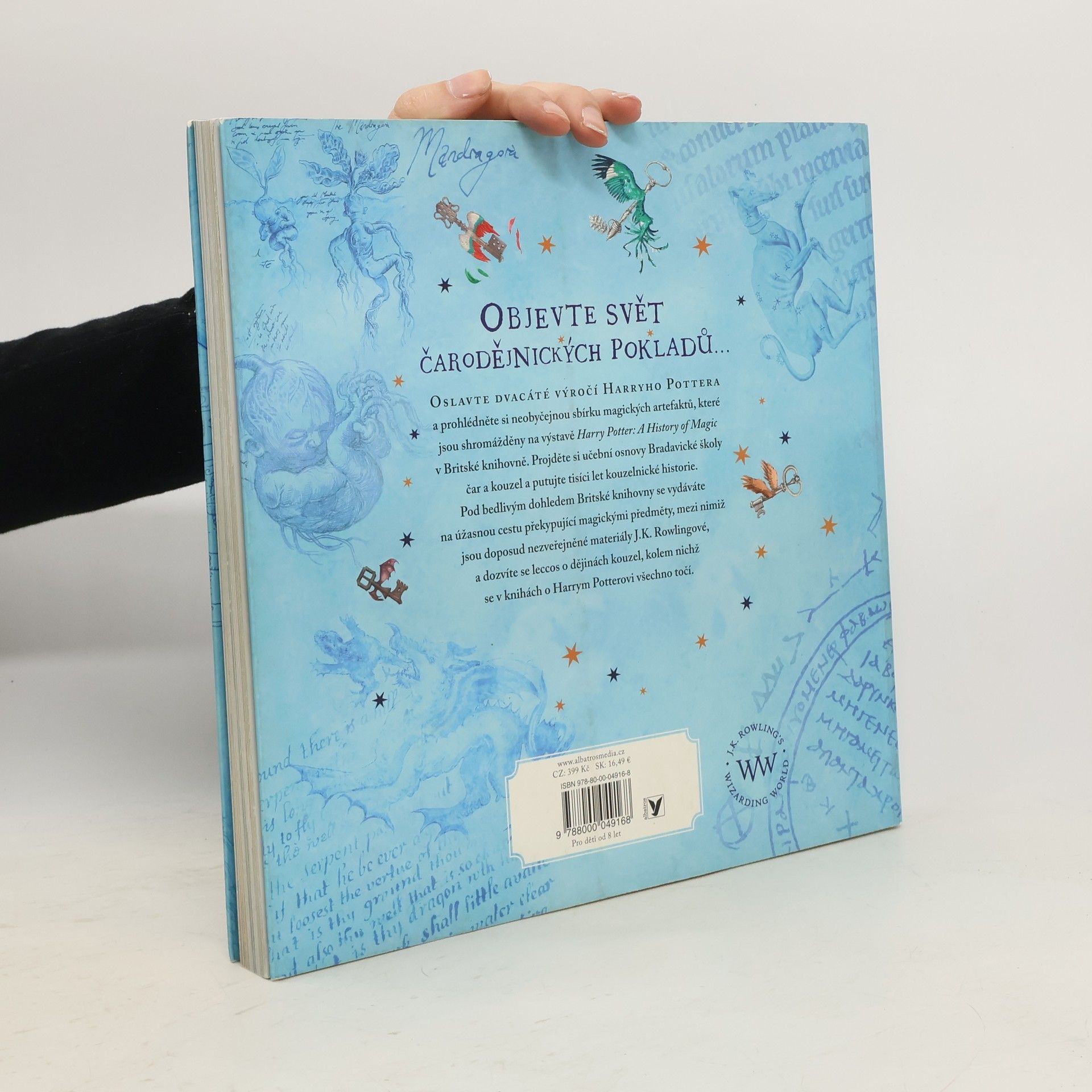 OBJEVTE SVĚT ČARODĚJNICKÝCH POKLADŮ... OSLAVTE DVACÁTÉ VÝROČÍ HARRYHO POTTERA a prohlédněte si neobyčejnou sbírku magických artefaktů, které jsou shromážděny na výstavě Harry Potter: A History of Magic v Britské knihovně. Projděte si učební osnovy Bradavické školy čar a kouzel a putujte ticíci let kouzelnické historie. Pod bedlivým dohledem Britské knihovny se vydáváte na úžasnou cestu překypující magickými předměty, mezi nimiž jsou doposud nezveřejněné materiály J.K. Rowlingové, a dozvíte se leccos o dějinách kouzel, kolem nichž se v knihách o Harrym Potterovi všechno točí. U PŘÍLEŽITOSTI DVACÁTÉHO VÝROČÍ původního vydání knihy Harry Potter a Kámen mudrců bereme čtenáře na úchvatnou cestu bradavickými školními osnovami od péče o kouzelné tvory a bylinkářství přes obranu proti černé magii a astronomii až po přeměňování. Za všemi těmito obory jsou tisíce let historie. Na stránkách této knihy objevíte pozoruhodné artefakty ze sbírek Britské knihovny, nikdy nepublikované skici a faksimile rukopisů J.K. Rowlingové a nádherné ilustrace Jima Kaye. Dozvíte se, odkud pochází Kámen mudrců a co skrývají strašliví draci a obtížní trollové. Sami si připravíte lektvar, prohlédnete si skutečné kouzelnické hůlky a zjistíte, proč doopravdy mandragory tak ječí. A pokocháte se stránkami z da Vinciho zápisníku nebo z nejstaršího atlasu noční oblohy.