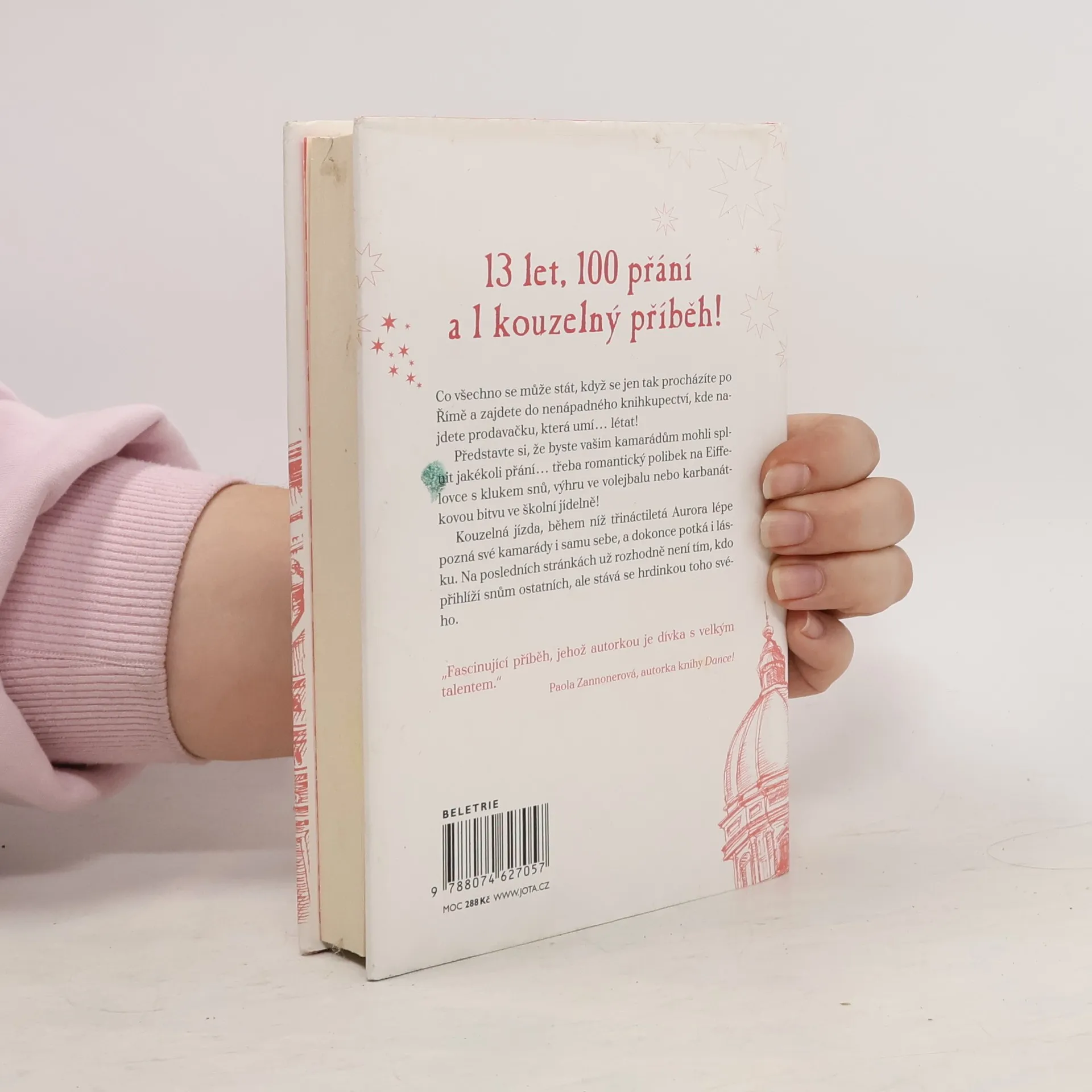 Je nedělení odpoledne a skoro třináctiletá Aurora Bílá právě vešla do knihkupectví, jehož prodavačka umí… létat! A nejen to, taky čarovat! Aurora díky ní zjistí, že pod jejím milovaným městem Římem se nachází vedení světa kouzel, a aby o něm nikomu neřekla, dostane od jeho královny velkolepý dar: 100 přání! Devadesát devět z nich však musí splnit ostatním a jen to poslední může být její. Aurořin život, předtím poklidný a plný knížek, se obrátí vzhůru nohama a nic už není jako dřív. Kvůli bláznivým přáním kamarádů a zákeřným přáním mladšího bratra se dostává z jednoho průšvihu do druhého, čeká ji domácí vězení i karbanátková bitva ve školní jídelně, ale také magický výlet do Paříže, spousta legrace a možná i první láska… Co si asi bude Aurora v závěru tohoto kouzelného dobrodružství přát? Bude dál jenom přihlížet snům ostatních, nebo se stane hrdinkou toho svého? Co všechno se může stát, když se jen tak procházíte po Římě a zajdete do nenápadného knihkupectví, kde najdete prodavačku, která umí… létat!