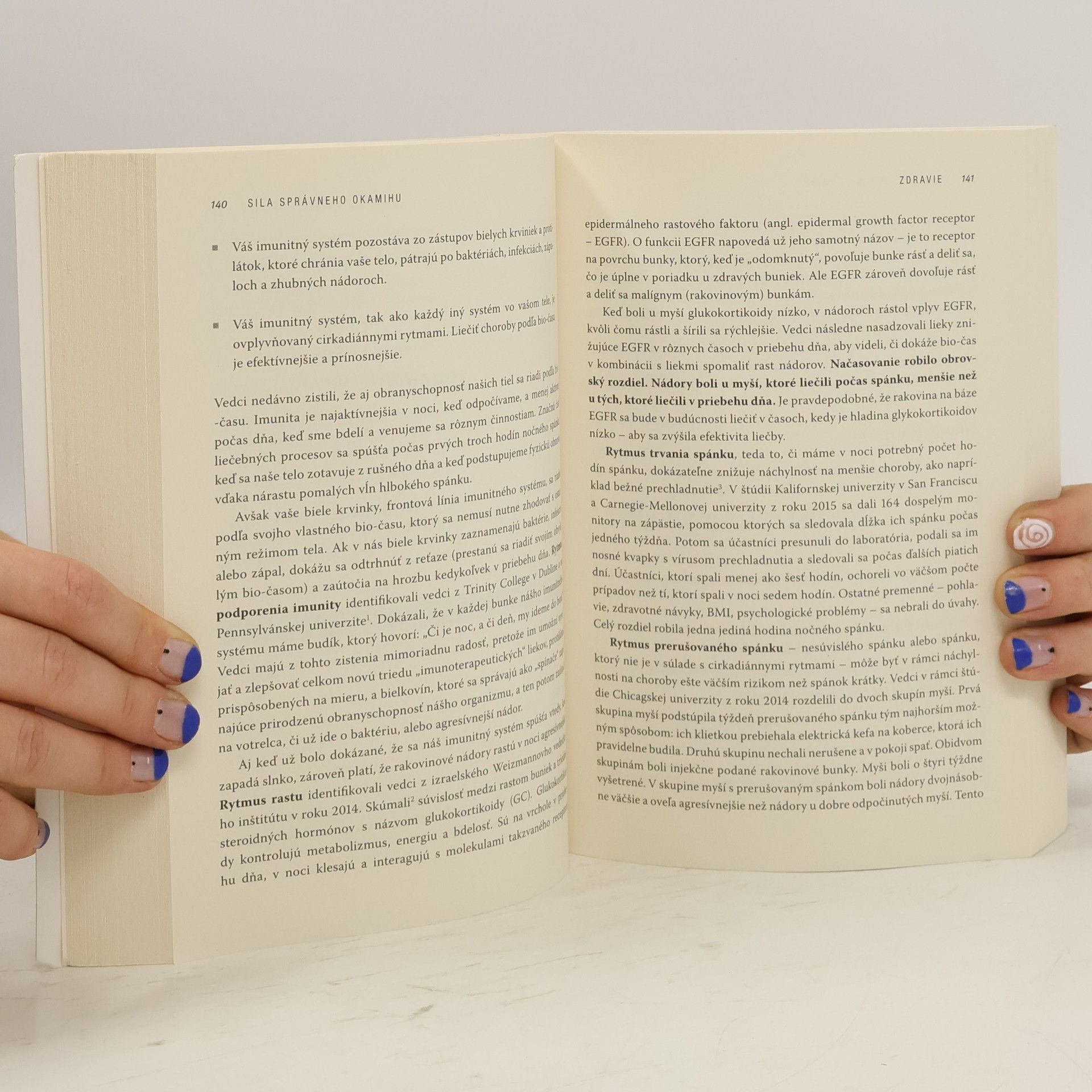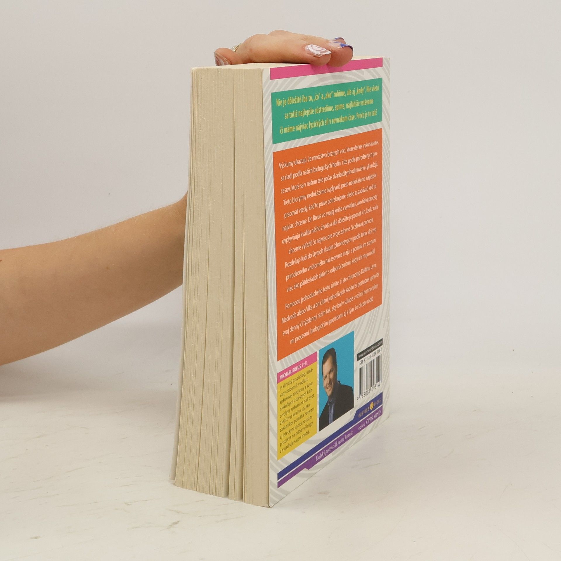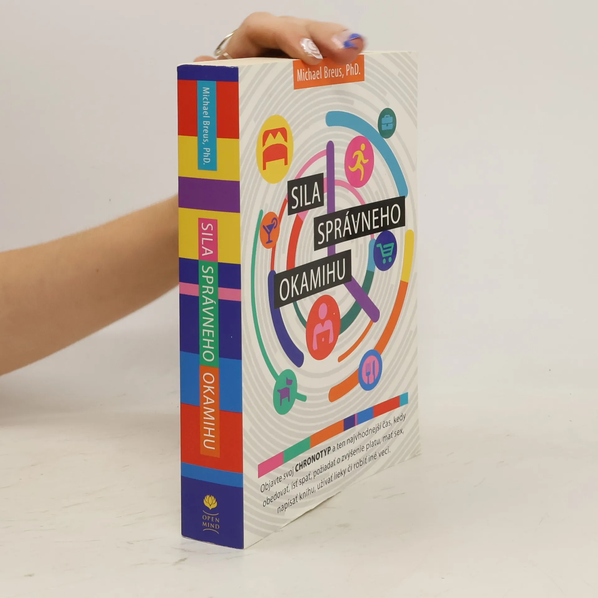 O knihe Objavte svoj chronotyp a ten najvhodnejší čas, kedy obedovať, ísť spať, požiadať o zvýšenie platu, mať sex, napísať knihu, užívať lieky či robiť iné veci. Nie je dôležité iba to, „čo“ a „ako“ robíme, ale aj „kedy“. Nie všetci sa totiž najlepšie sústredíme, spíme, najľahšie vstávame či máme najviac fyzických síl v rovnakom čase. Prečo je to tak? Množstvo bežných vecí, ktoré denne vykonávame, sa totiž riadi podľa našich biologických hodín, čiže podľa prirodzených procesov, ktoré sa v našom tele počas dvadsaťštyrihodinového cyklu dejú. Tieto biorytmy nedokážeme ovplyvniť, preto nedokážeme najlepšie pracovať vtedy, keď to práve potrebujeme, alebo sa zabávať, keď to najviac chceme. V knihe sa dozviete, prečo je dôležité tieto procesy poznať a ako z nich vyťažiť čo najviac pre svoje zdravie a celkovú pohodu. Autor rozdeľuje ľudí do štyroch skupín (chronotypov) podľa toho, aký typ prirodzeného vnútorného načasovania majú a odporúča im, kedy majú čo robiť.