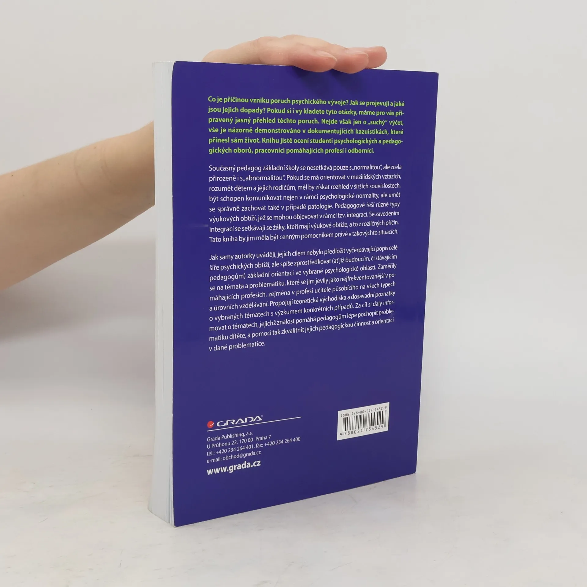 Současný pedagog základní školy se nesetkává pouze s „normalitou“, ale zcela přirozeně i s „abnormalitou“. Pokud se má orientovat v mezilidských vztazích, rozumět dětem a jejich rodičům, měl by získat rozhled v širších souvislostech, být schopen komunikovat nejen v rámci psychologické normality, ale umět se správně zachovat také v případě patologie. Pedagogové řeší různé typy výukových obtíží, jež se mohou objevovat v rámci tzv. integrací. Se zavedením se setkávají se žáky, kteří mají výukové obtíže, a to z rozličných příčin. Tato kniha by jim měla být cenným pomocníkem právě v takovýchto situacích. Jak samy autorky uvádějí, jejich cílem nebylo předložit vyčerpávající popis celé šíře psychických obtíží, ale spíše zprostředkovat (ať již budoucím, či stávajícím pedagogům) základní orientaci ve vybrané psychologické oblasti. Zaměřily se na témata a problematiku, které se jim jevily jako nejfrekventovanější v pomáhajících profesích, zejména v profesi učitele působícího na všech typech a úrovních vzdělávání. Propojují teoretická východiska a dosavadní poznatky o vybraných tématech s výzkumem konkrétních případů. Za cíl si daly informovat o tématech, jejichž znalost pomáhá pedagogům lépe pochopit problematiku dítěte, a pomoci tak zkvalitnit jejich pedagogickou činnost a orientaci v dané problematice.