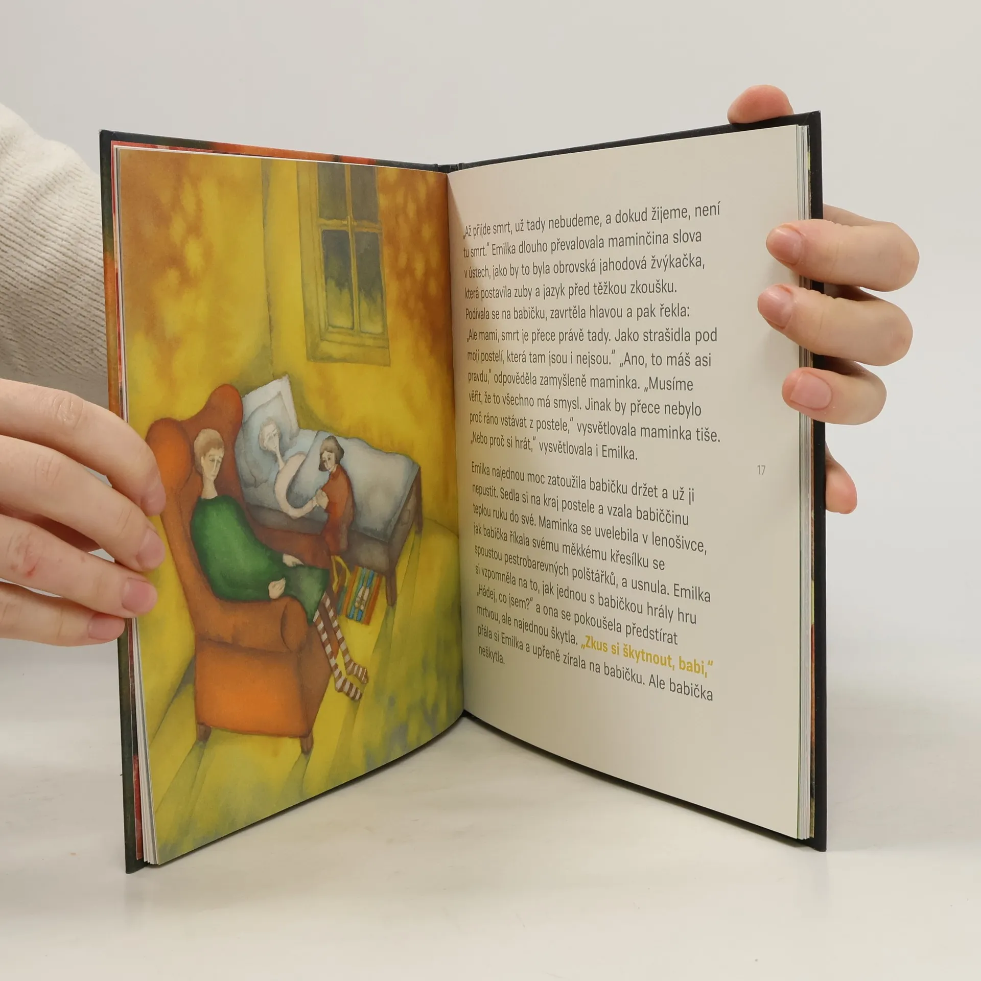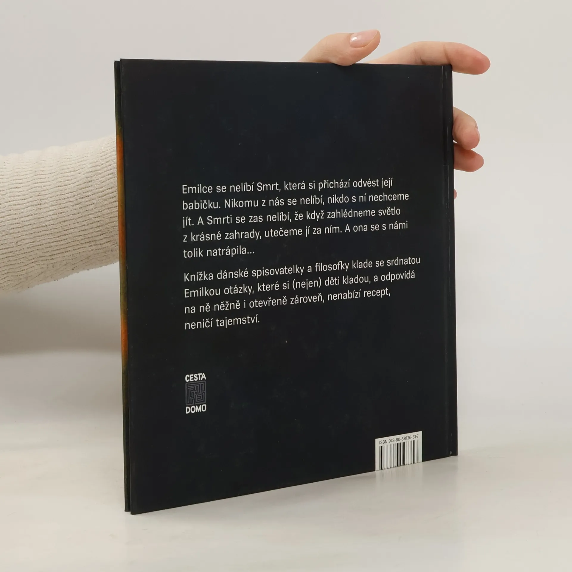Emilce se nelíbí Smrt, která si přichází odvést její babičku. Nikomu z nás se nelíbí, nikdo s ní nechceme jít. A Smrti se zas nelíbí, že když zahlédneme světlo z krásné zahrady, utečeme jí za ním. A ona se s námi tolik natrápila… Knížka dánské spisovatelky klade se srdnatou Emilkou otázky, které si (nejen) děti kladou, a odpovídá na ně něžně i otevřeně zároveň, nenabízí recept, neničí tajemství.