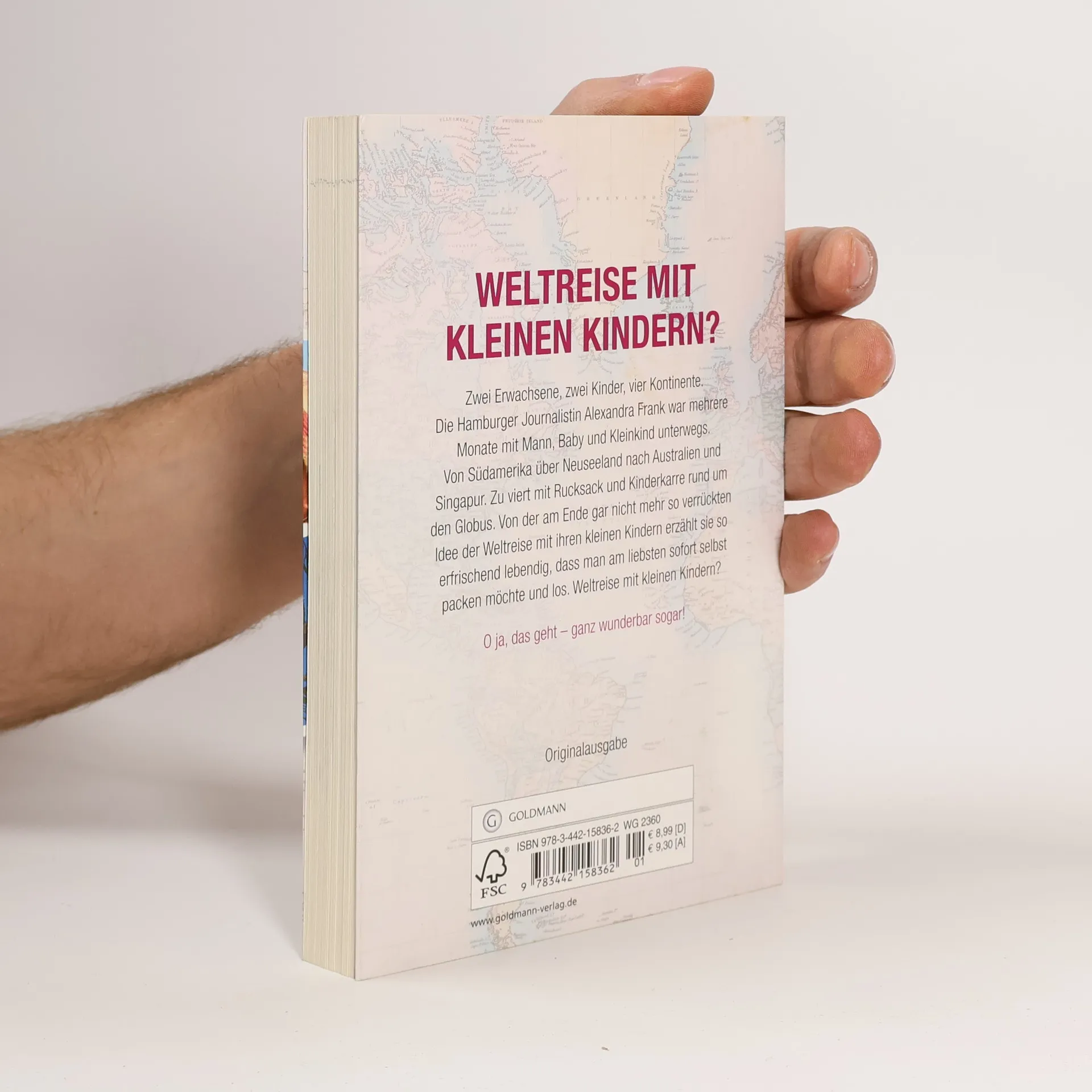 Zwei Erwachsene, zwei Kinder, vier Kontinente. Zwei Erwachsene, zwei Kinder, vier Kontinente. Die Journalistin Alexandra Frank war fünf Monate lang mit Mann, Baby und Kleinkind unterwegs auf Weltreise. Von Südamerika über Neuseeland nach Australien und Singapur. Zu viert mit Rucksack und Kinderkarre rund um den Globus: da wird jeder Tag zum Sonntag. Ausgewählte Erlebnisse hatte Alexandra Frank während der Reise in ihrem Blog „4 um die Welt“ bei SPIEGEL Online veröffentlicht. Hier erzählt sie nun die ganze Geschichte, von der am Ende gar nicht mehr so verrückten Idee übers erste Packen bis zum Nachhausekommen. Ihr Fazit: Weltreise mit kleinen Kindern geht, ganz wunderbar sogar. Ausstattung: s/w-Fotos
