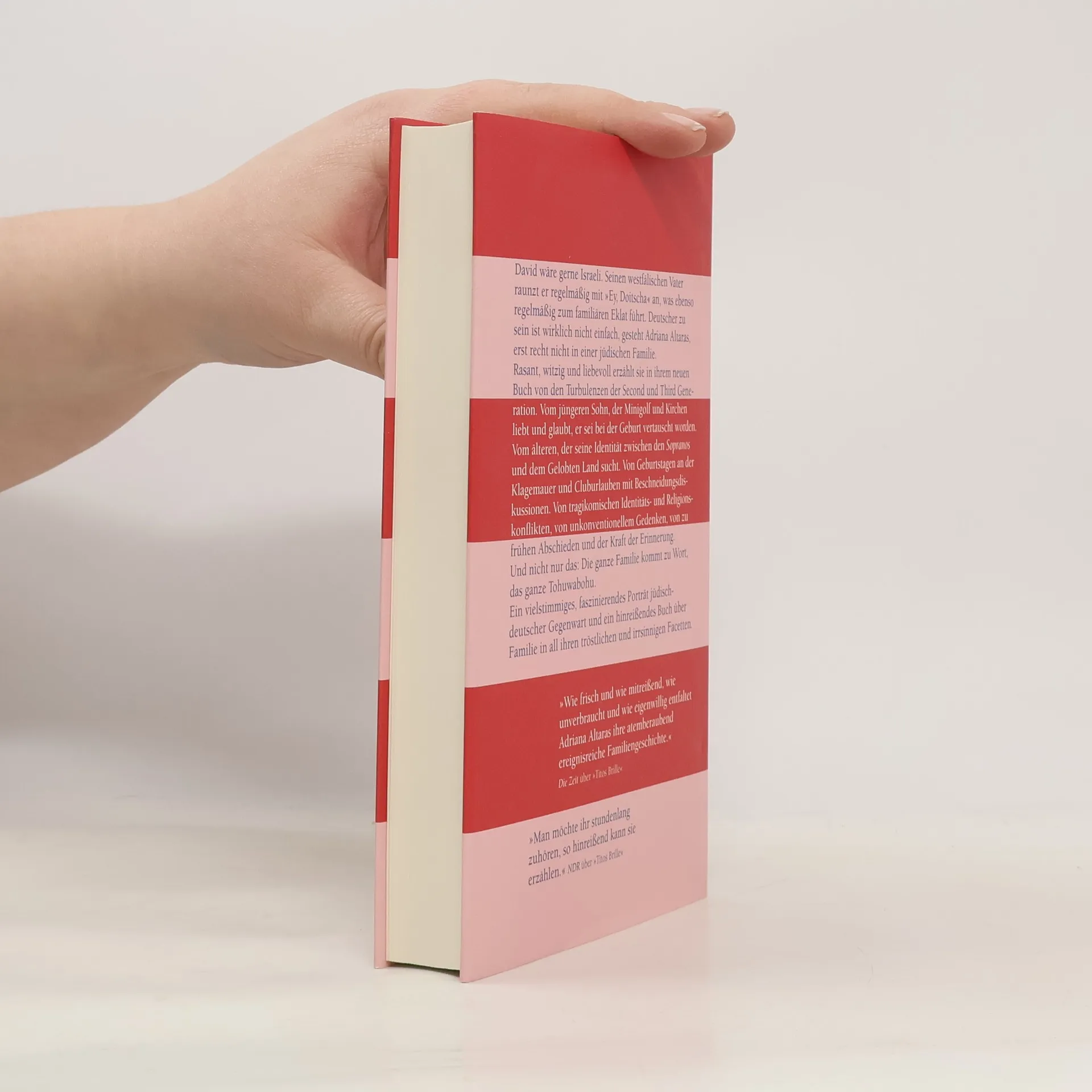 David ist nicht nur hochintelligent, sondern auch hochpubertär. Der Einzige, auf den er hört, ist sein Patenonkel Aron. Mit diesem ist Adriana Altaras seit ihrer Jugend befreundet. Sie überlegten damals, gemeinsam auszuwandern nach Israel, das für sie ähnlich verlockend war wie für die Surfer Hawaii. Doch sie blieben und nutzen das schlechte Gewissen der Deutschen, um umsonst Bahn zu fahren oder schulfrei zu bekommen. Als Aron stirbt, spitzt sich der Generationenkonflikt in der Familie Altaras zu. David hält nichts mehr in Berlin, er verabschiedet sich kurzerhand ins Gelobte Land, und die Mutter reist hinterher – auf der Suche nach dem verlorenen Sohn zwischen Klagemauer, See Genezareth und Kibbuz. In »Titos Brille«, von den Lesern geliebt und von der Presse gefeiert, hat sich die Autorin der Geschichte ihrer Vorfahren gewidmet. Mitreißend, witzig und herrlich turbulent erzählt sie nun mitten aus dem jüdischen Leben heute in Deutschland. Vom jüngeren Sohn, der lieber »Germany’s Next Topmodel« sähe, als zuzuschauen, wie sich seine Mutter in Talkshows über die »schönen Schmocks« ihrer Söhne äußert. Vom älteren, der die Pubertät in vollen Zügen auskostet, aber an Jom Kippur fastet wie ein Großer. Von Identitätskonflikten, die sich an einer rissigen Salatschüssel entzünden