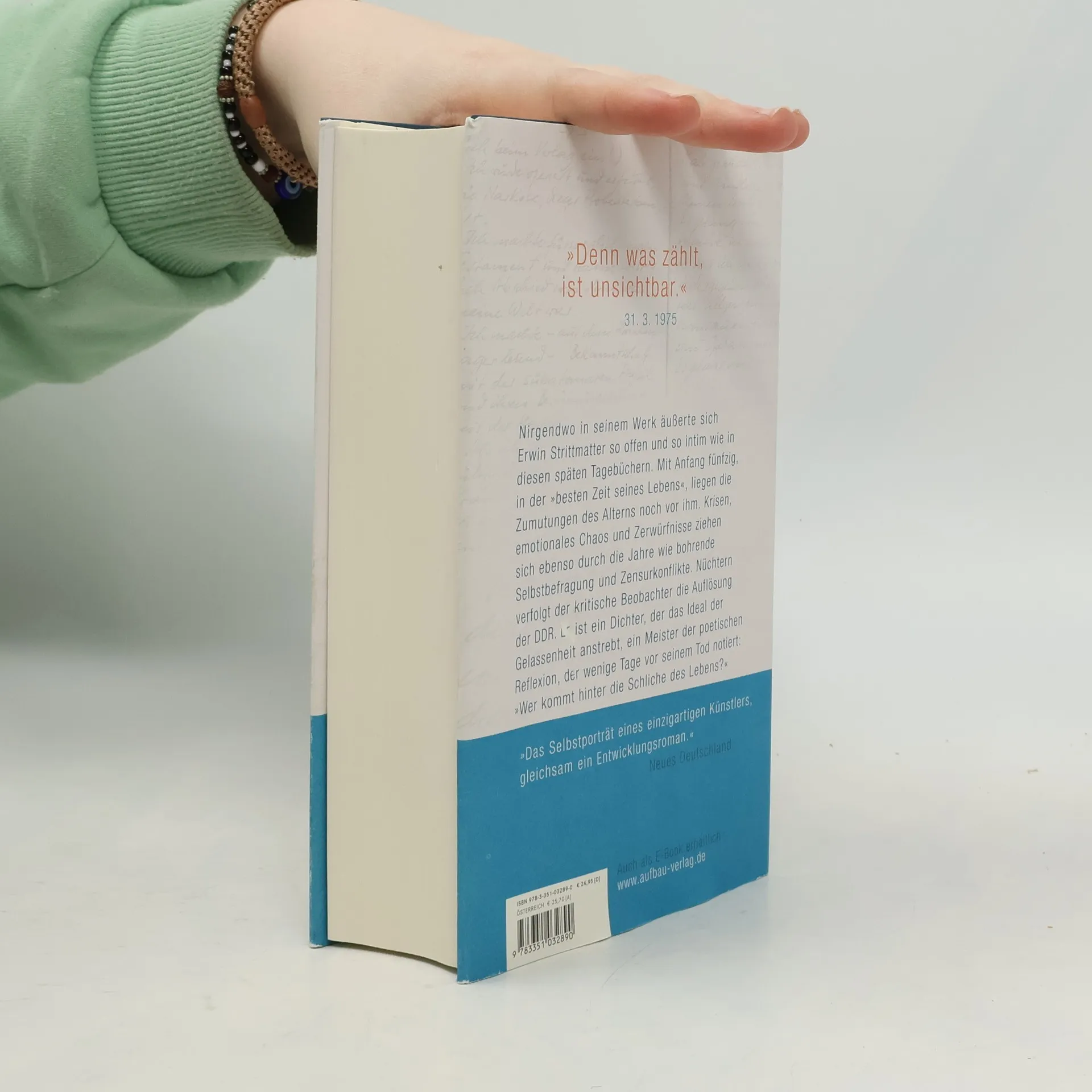 „Denn was zählt, ist unsichtbar und führt zu einem Ziel, was keiner von uns kennt.“ In diesen späten Tagebüchern äußert sich Erwin Strittmatter so offen und intim wie nie zuvor. Mit Anfang fünfzig, in der „besten Zeit seines Lebens“, stehen ihm die Herausforderungen des Alterns bevor. Krisen, emotionales Chaos und Zerwürfnisse prägen seine Jahre, während er sich bohrenden Selbstbefragungen und Zensurkonflikten stellt. Nüchtern beobachtet er die Auflösung der DDR und reflektiert über sein Leben als Dichter, der Gelassenheit anstrebt. Er spricht von Ehekrisen, der Entfremdung zu seiner Frau Eva, Eifersucht auf die Beziehung seiner Söhne zu ihrer Mutter und den Schwierigkeiten des Alterns. Trotz seines Rückzugs aus dem öffentlichen Leben bleibt er ein kritischer Zeitgenosse. Eine zentrale Frage beschäftigt ihn: seine frühere Parteigläubigkeit. Er hat längst die Utopien aufgegeben und zieht ein nüchternes Fazit seines Lebens in der DDR: „Ich ernte, was ich anbaute.“ Emotionslos registriert er die Auflösung der sozialistischen Welt und wertet die Umbruchprozesse von 1989/90 als Konsequenz verfehlter Politik. Seine Notizen dokumentieren eindrucksvoll die hektischen Ereignisse jener Jahre. In diesem Kontext gelingen ihm Naturbeobachtungen, die Gelassenheit und poetische Leichtigkeit seines Spätwerks widerspiegeln.