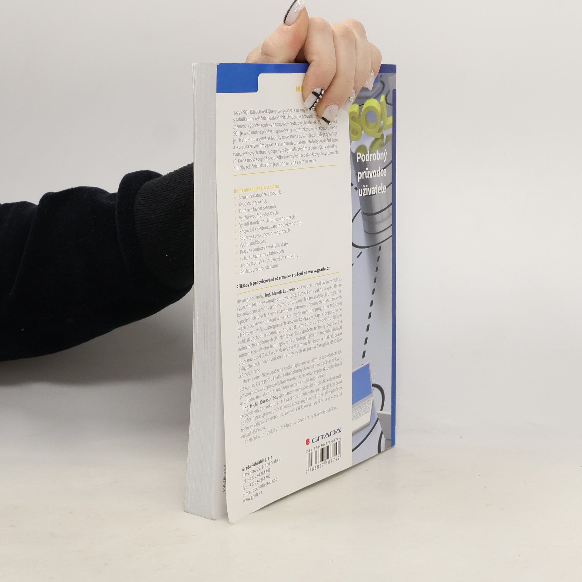 Jazyk SQL (Structured Query Language) je účinným nástrojem pro práci s tabulkami v relačních databázích. Umožňuje provádět výběry a řazení záznamů, výpočty, souhrny a spojovat více datových tabulek. Pomocí jazyka SQL je také možné přidávat, upravovat a mazat záznamy v tabulce, měnit jejich strukturu a vytvářet tabulky nové. Z jazyka SQL jsou v knize zařazeny běžně používané základní partie, společné pro všechny databázové systémy. Kniha zahrnuje odchylky běžných systémů od standardu SQL tak, aby byla univerzálně použitelná (není orientována na určitý databázový systém). Běžné systémy zahrnují Access, MS SQL Server, MySQL, Postgre, příp. Visual Fox Pro). Pozornost je věnována i objektově relačnímu mapování. Jednotlivé kapitoly jsou vždy doplněny sérií příkladů pro samostatná řešení. Soubory, potřebné pro vypracování příkladů v databázích SQL Serveru a MySQL, naleznete na webových stránkách nakladatelství Grada. Po zvládnutí knihy bude každý schopen získávat z databáze jednoduché přehledy, třídit je podle různých kritérií a omezovat podle jednoduchých podmínek. Publikace může být užitečná i pro tvůrce webových stránek, popř. vyspělým uživatelům tabulkových kalkulátorů. Nevyžaduje žádné předběžné znalosti o databázových systémech; principy relačních databází jsou popsány na začátku knihy.