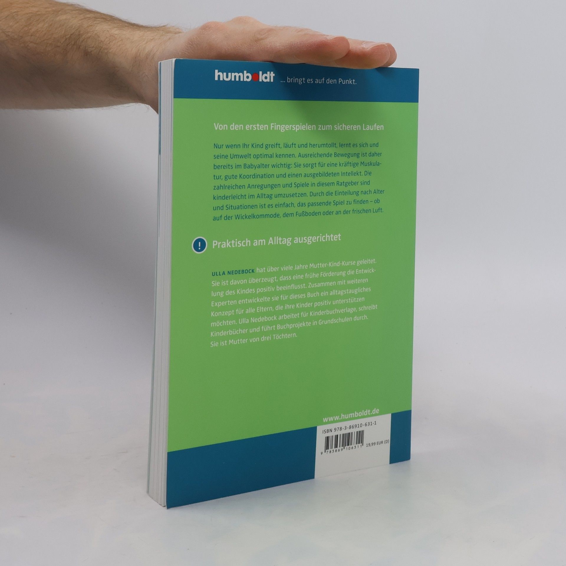 • Von den ersten Fingerspielen zum sicheren Laufen: Nur • Anregungen und Bewegungsspiele für Kinder von 0 bis 2 Jahren – unterteilt nach Alter und Entwicklungsstufen • Absolut praktisch und alltagstauglich • Die Autorin hat jahrzehntelange Erfahrung im Umgang mit Babys Von den ersten Fingerspielen zum sicheren Laufen Nur wenn Ihr Kind greift, läuft und herumtollt, lernt es sich und seine Umwelt optimal kennen. Ausreichende Bewegung ist daher bereits im Babyalter wichtig: Sie sorgt für eine kräftige Muskulatur, gute Koordination und einen ausgebildeten Intellekt. Die zahlreichen Anregungen und Spiele in diesem Elternratgeber sind kinderleicht im Alltag umzusetzen. Durch die Einteilung nach Alter und Situationen ist es einfach, das passende Spiel zu finden – ob auf der Wickelkommode, dem Fußboden oder an der frischen Luft. Für alle, die die Entwicklung ihres Kindes liebevoll fördern möchten! Richtig praktisch: Viele Übungen und Bewegungsspiele im Buch sind anschaulich bebildert und dadurch ganz einfach nachzumachen. Aus dem Inhalt: Das erste halbe Jahr - Anregungen für die ersten Wochen - Das Kind transportieren - Turnen auf der Wickelkommode Das zweite halbe Jahr - Übungen zur Kräftigung - Mama- Baby-Yoga - Die Feinmotorik schulen Schon ein Jahr alt - Bewegungsideen für alle Tage - Spiellieder im Stehen - Barfußspiele Das vierte halbe Jahr - Raus in die Sonne! - Massagen für größere, kleine Kinder