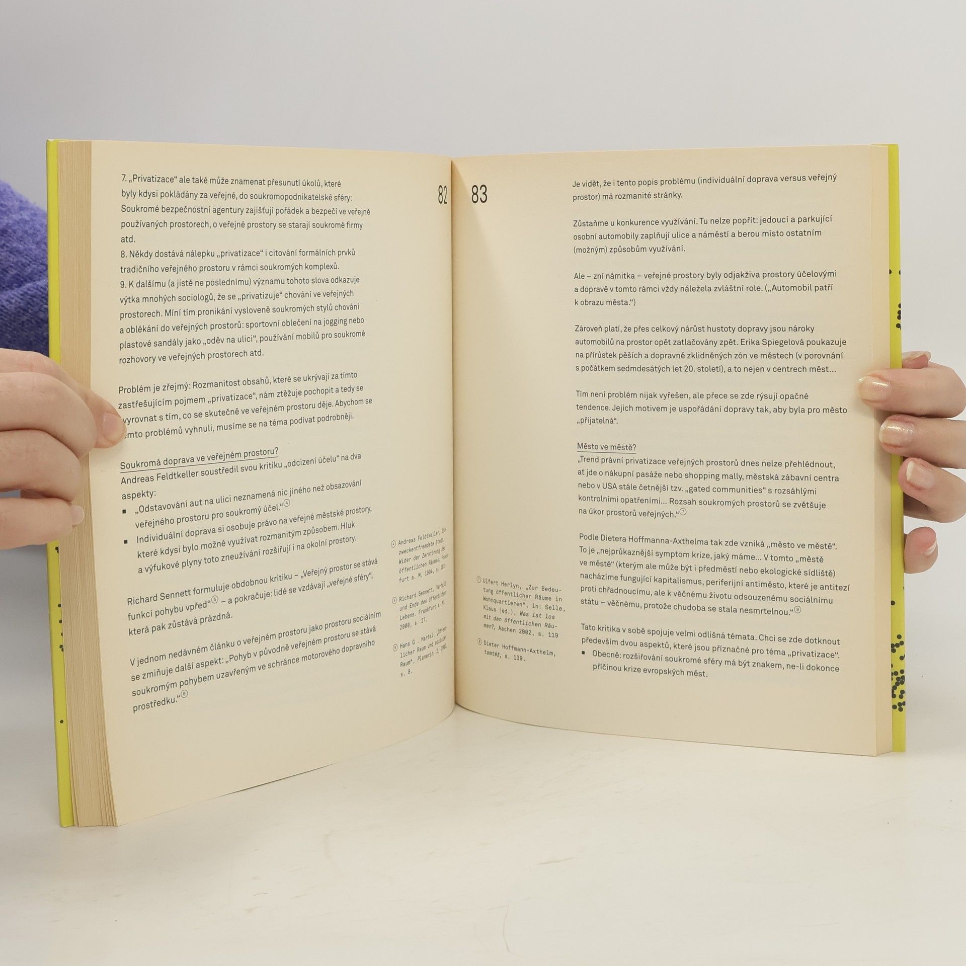 Téma veřejného prostoru patří dnes ke klíčovým tématům architektonické diskuze i k důležitým motivům městských politik a plánů. Co je však tak nového na tématu veřejného prostoru, že přitahuje pozornost tvůrců, politiků i teoretiků na architektonických výstavách, konferencích a v médiích? Možná, že je to právě novodobá nesamozřejmost veřejného prostoru: jeho zpochybnění, rozklad jeho fyzické formy i tradiční funkce a opětovné hledání jeho nových forem i nové náplně. Výběr textů předních architektů, urbanistů, sociologů i právníků se pokouší postihnout dvojznačnost veřejného prostoru jako prostoru fyzického i sociálního a zároveň poukázat na rozdílné hodnotící postoje, na rozkmit mezi ohlašováním krize a rozkladu veřejného prostoru na jedné straně a pozitivním hledáním nových forem a programů na straně druhé.