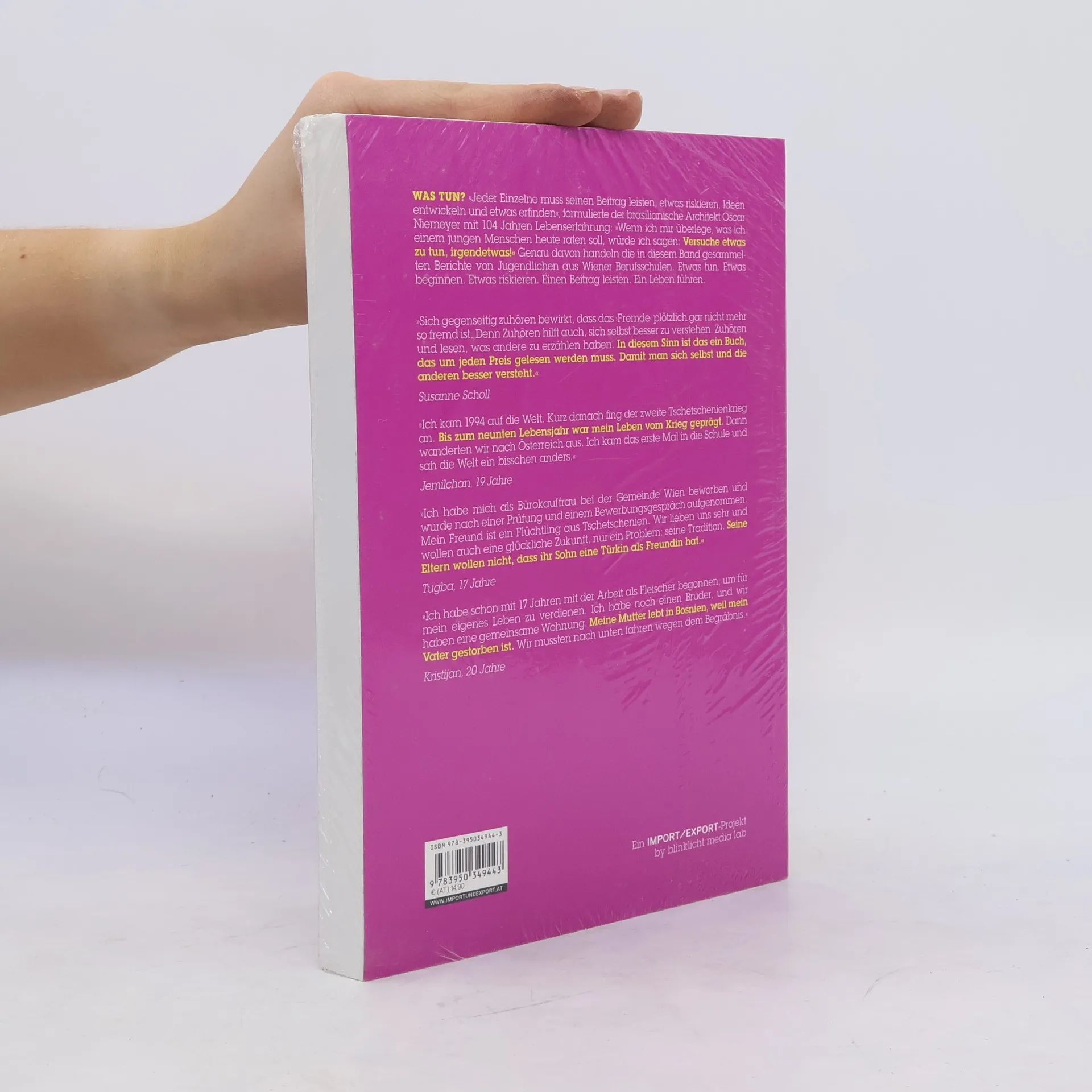WAS TUN? »Jeder Einzelne muss seinen Beitrag leisten, etwas riskieren, Ideen entwickeln und etwas erfinden«, formulierte der brasilianische Architekt Oscar Niemeyer mit 104 Jahren Lebenserfahrung: »Wenn ich mir überlege, was ich einem jungen Menschen heute raten soll, würde ich sagen: Versuche etwas zu tun, irgendetwas!« Genau davon handeln die in diesem Band gesammelten Berichte von Jugendlichen aus Wiener Berufsschulen. Etwas tun. Etwas beginnen. Etwas riskieren. Einen Beitrag leisten. Ein Leben führen.
