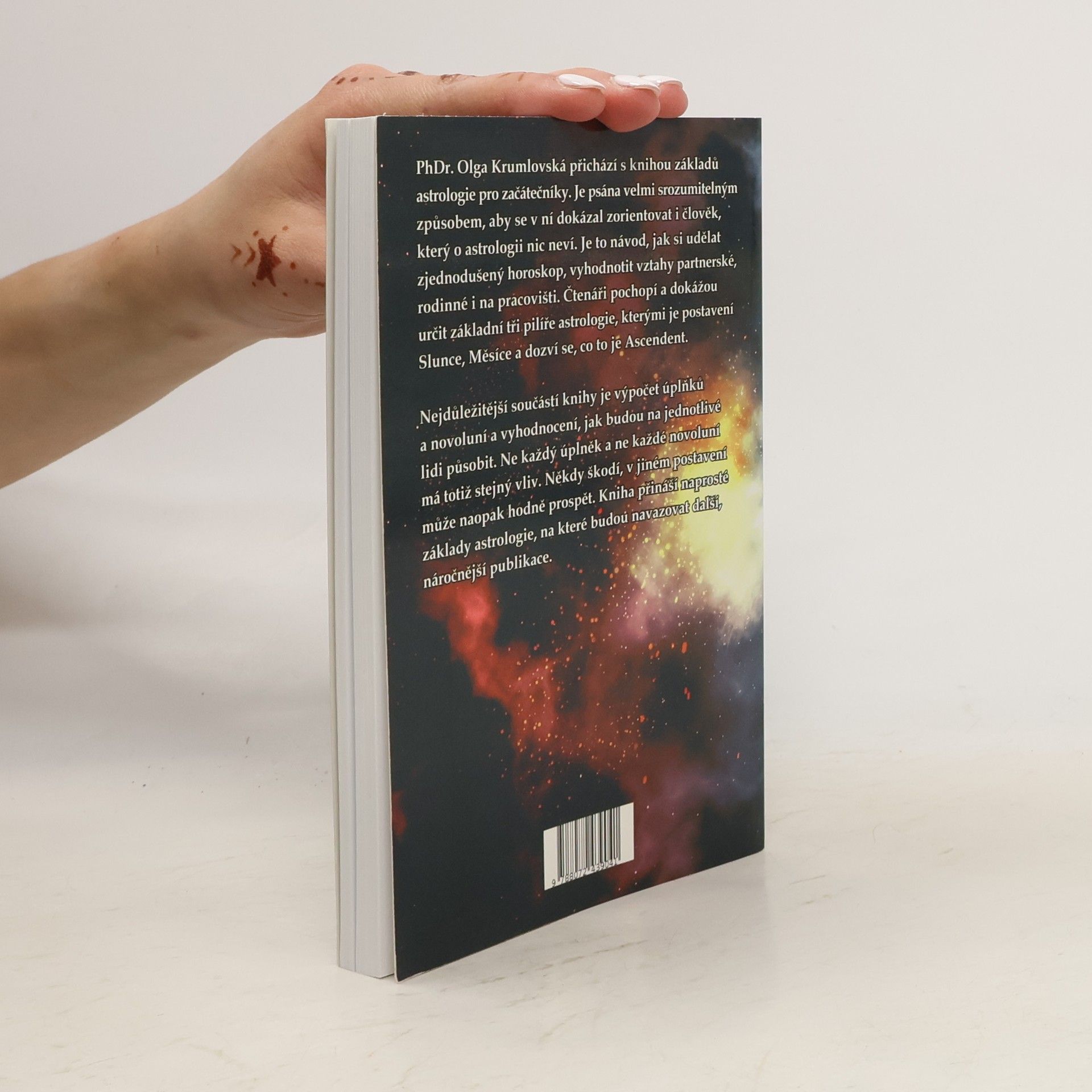 Jak vytvořit jednoduchý horoskop PhDr. Olga Krumlovská přichází s knihou základů astrologie pro začátečníky. Je psána velmi srozumitelným způsobem, aby se v ní dokázal zorientovat i člověk, který o astrologii nic neví. Je to návod, jak si udělat zjednodušený horoskop, vyhodnotit vztahy partnerské, rodinné i na pracovišti. Čtenáři pochopí a dokážou určit základní tři pilíře astrologie, kterými je postavení Slunce, Měsíce a dozví se, co je to Ascendent. Nejdůležitější součástí knihy je výpočet úplňků a novoluní a vyhodnocení, jak budou na jednotlivé lidi působit. Ne každý úplněk a ne každé novoluní má totiž stejný vliv. Někdy škodí, v jiném postavení může naopak hodně prospět. Kniha přináší naprosté základy astrologie, na které budou navazovat další náročnější publikace.