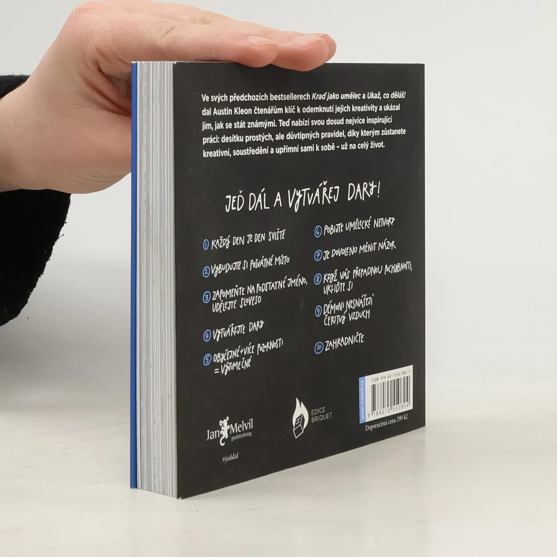 Možná bychom sem už nemuseli nic psát, protože představovat Austina Kleona našim čtenářům je nejspíš zbytečné… Ale my se tak těšíme! Pojďme si to raději shrnout: novinka plná kreativního povzbuzení pro chvíle, kdy si myslíte, že už nikdy nic nevytvoříte, protože nápady došly, vyšla v originále letos v dubnu. Ve svých předchozích knihách – Kraď jako umělec a Ukaž, co děláš! (obě jsou mimochodem bestsellerem jak podle New York Times, tak i dle nás), nám Austin Kleon ukázal, jak objevit svou kreativitu a jak o sobě dát vědět světu. Nyní nabízí to nejdůležitější: deset pravidel, jak o kreativitu nepřijít, zůstat soustředěný a věrný sám sobě – a to celoživotně. Tvořivost není rovná cesta s jasným začátkem i koncem, ale spíše smyčka. Kniha je vtipným návodem na to, jak se v různých odbočkách naší práce a tvorby neztratit, jak nesejít z cesty a mít správně nastavený cíl. Austine, děkujeme, těšíme, jedeme dál!