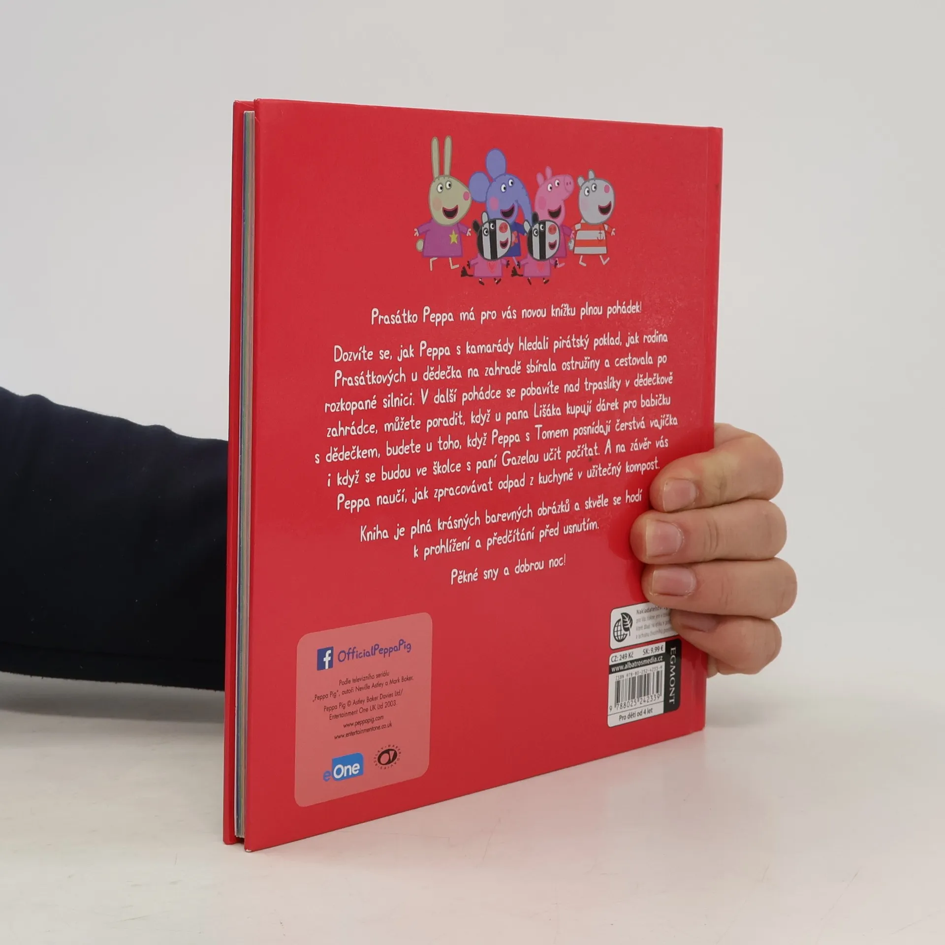 V nové knížce plné pohádek si přečtete, jak Peppa s kamarády hledala pirátský poklad nebo se ve školce učila počítat, o tom, jak s rodinou sbírali ostružiny, nakupovali u pana Lišáka, cestovali po rozkopané silnici, stavěli studnu přání, sbírali čerstvá vajíčka a vyráběli kompost. Knížka s krásnými obrázky se skvěle hodí k předčítání přes usnutím!