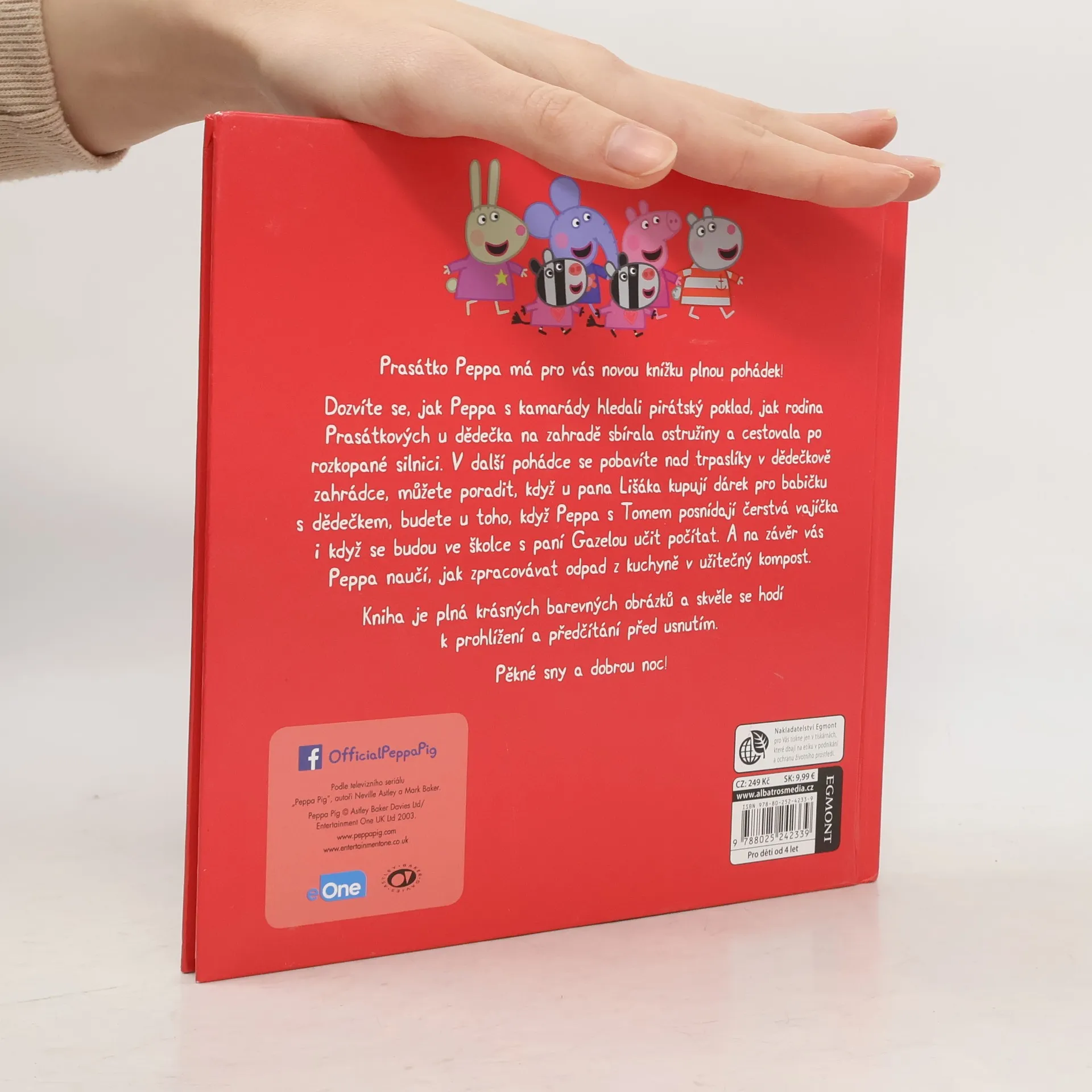 V nové knížce plné pohádek si přečtete, jak Peppa s kamarády hledala pirátský poklad nebo se ve školce učila počítat, o tom, jak s rodinou sbírali ostružiny, nakupovali u pana Lišáka, cestovali po rozkopané silnici, stavěli studnu přání, sbírali čerstvá vajíčka a vyráběli kompost. Knížka s krásnými obrázky se skvěle hodí k předčítání přes usnutím!