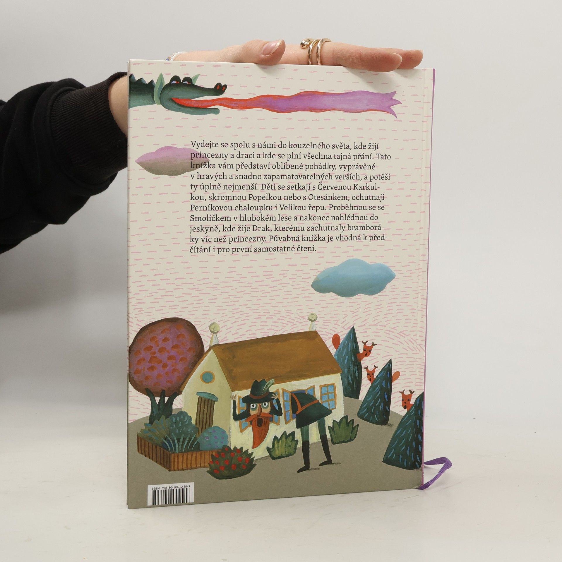 Nejznámější a nejoblíbenější pohádky vypráví autorka ve verších, které svým laděním připomenou klasika české poezie pro děti – Františka Hrubína. V hravých a snadno zapamatovatelných rýmech se děti seznámí například s Karkulkou a zlým vlkem, Otesánkem, skromnou Popelkou, líným Honzou, ale také drakem, kterému zachutnaly nejrůznější dobroty natolik, že pak místo princezen jedl raději škubánky, koláče a bramboráky. Nechybí ani ježibaba z perníkové chaloupky, neposlušný Smolíček či babka s dědkem a velikou řepou. Veršované pohádky jsou vhodné k předčítání i pro první samostatné čtení.