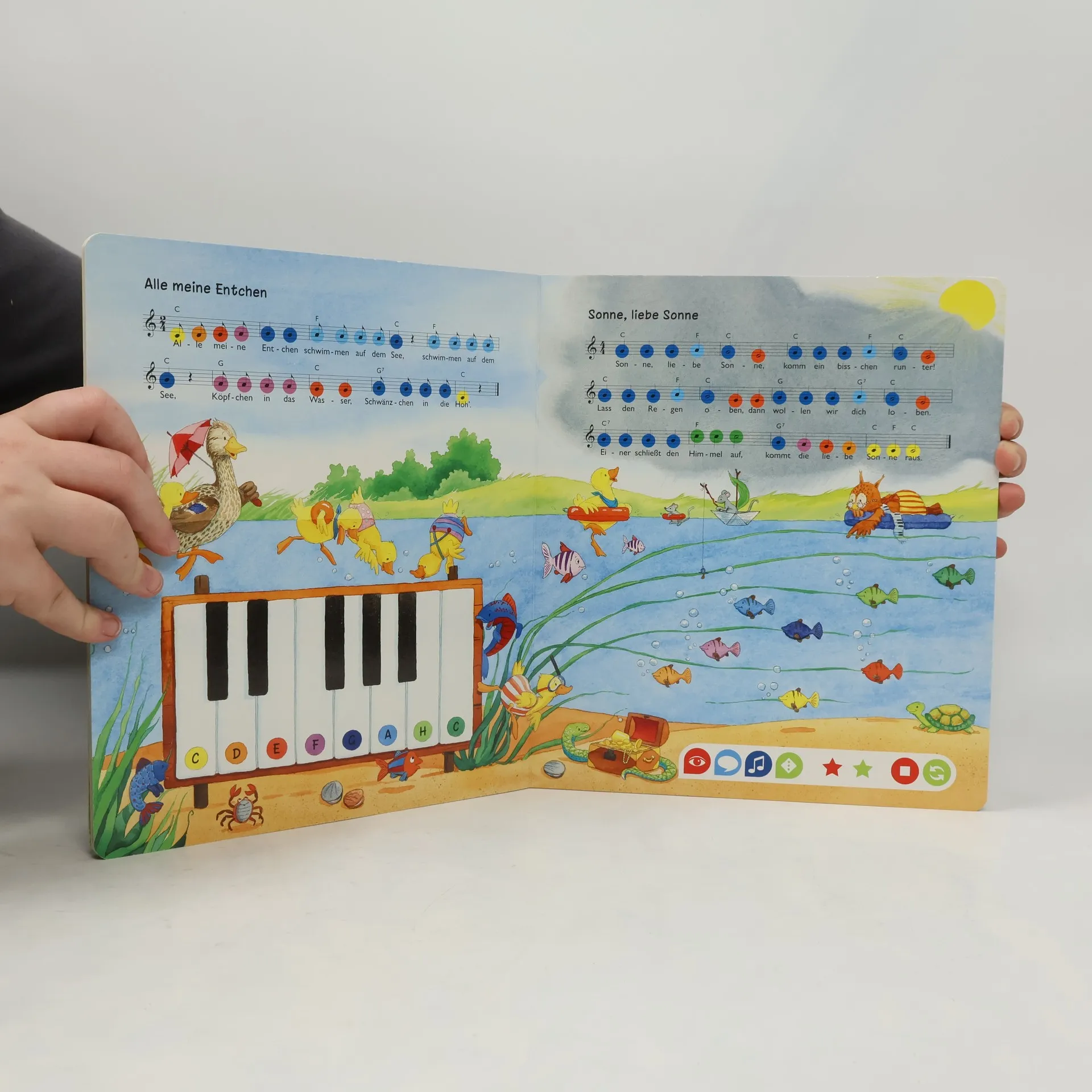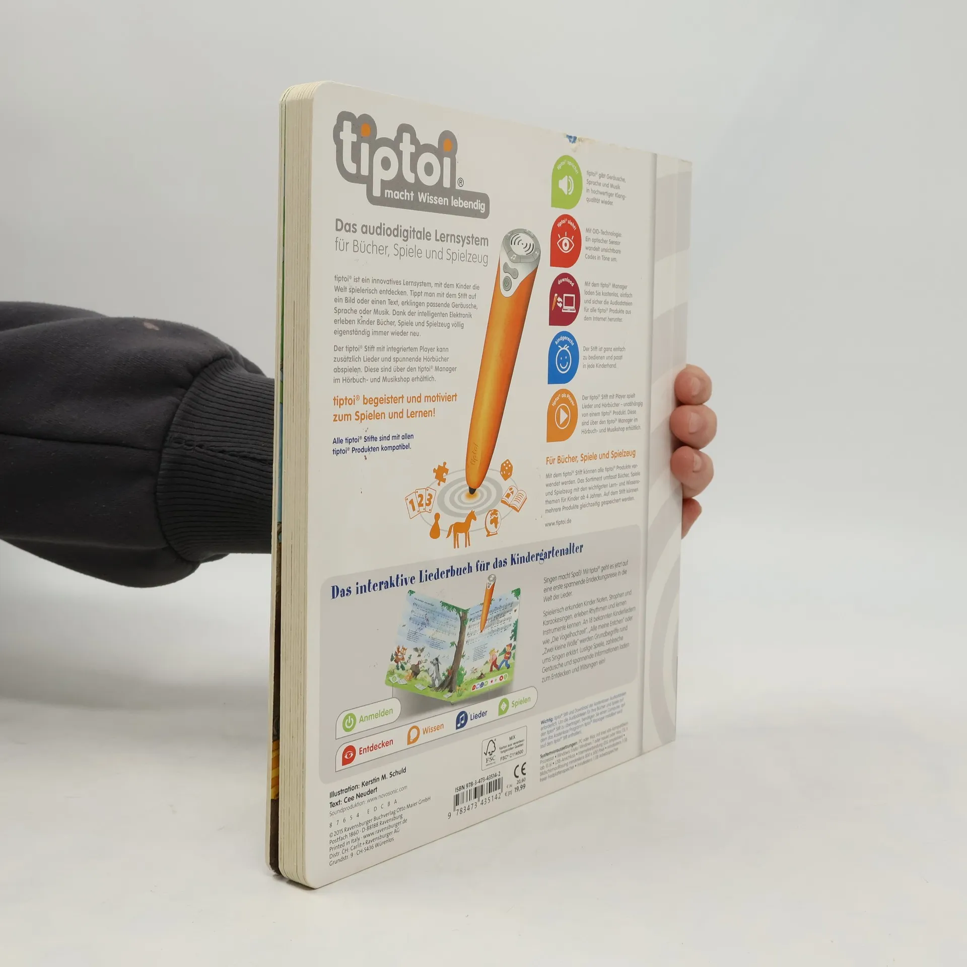 Singen und Musizieren ist das ideale Thema für tiptoi®. Mit dem Stift können Kinder 18 bekannte und beliebte Lieder komplett oder strophenweise abspielen oder die Playbackversion zum Mitsingen auswählen. Lustige Spiele und eine animative Klaviatur sind weitere Mitmachelemente. Erklärt werden viele Begriffe wie Note, Tonleiter oder Kanon. Alle Lieder sind mit Notensatz und Gitarrenakkorden abgedruckt, einem Hauskonzert steht also nichts mehr im Wege.