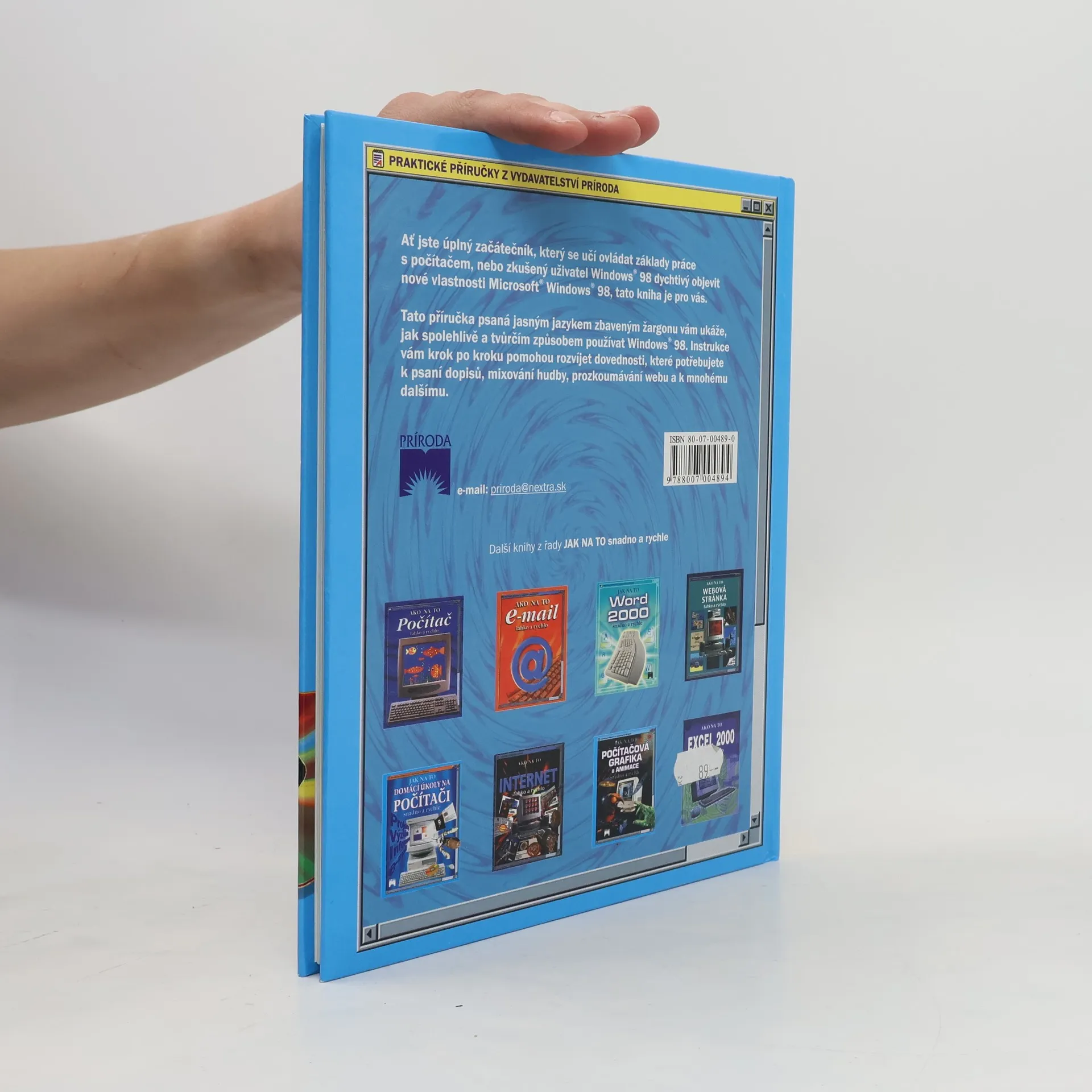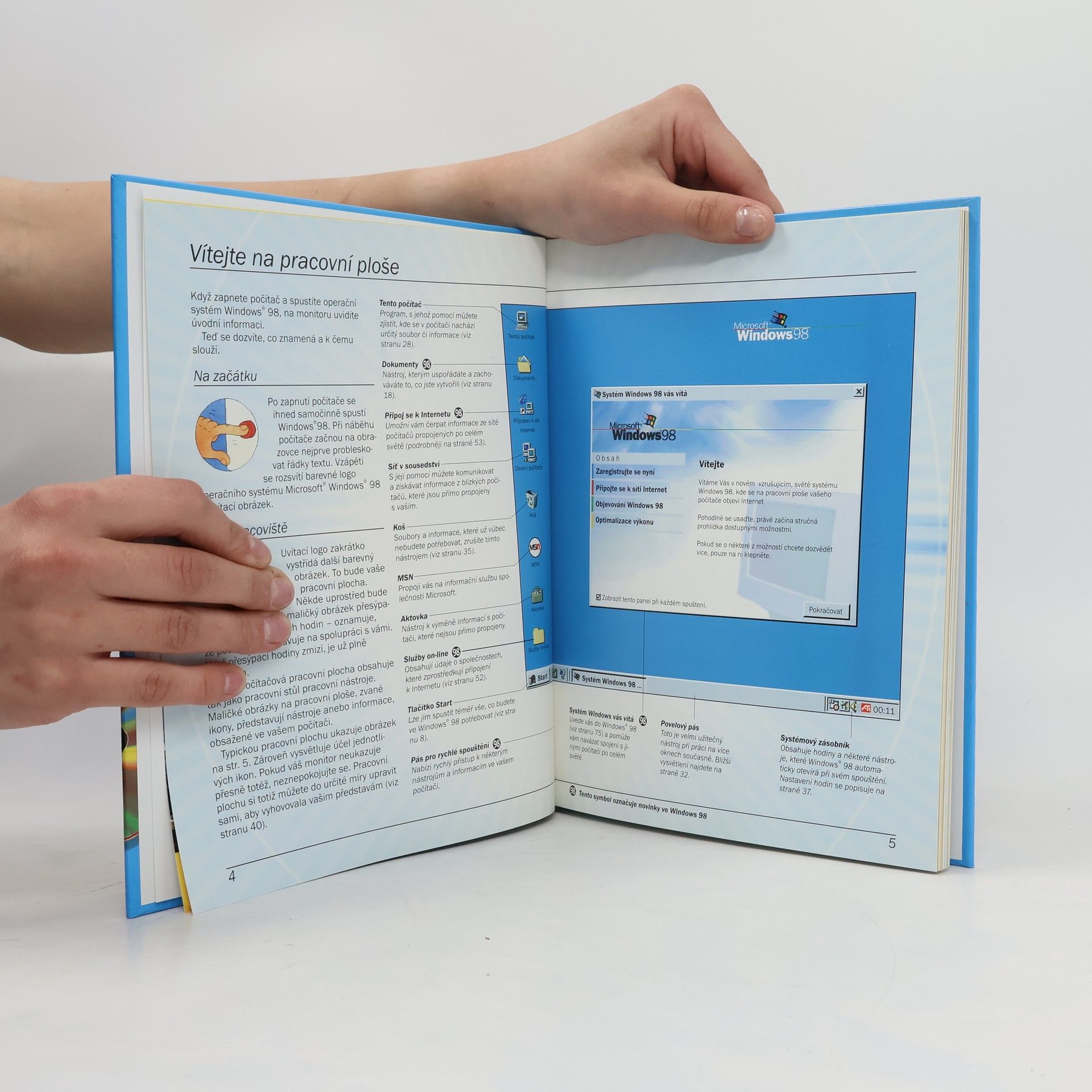 Informace z obálky: Tato příručka psaná jasným jazykem zbaveným žargonu vám ukáže, jak spolehlivě a tvůrčím způsobem používat Windows 98. Instrukce vám krok po kroku pomohou rozvíjet dovednosti, které potřebujete k psaní dopisů, mixování hudby, prozkoumávání webu a k mnohému dalšímu.