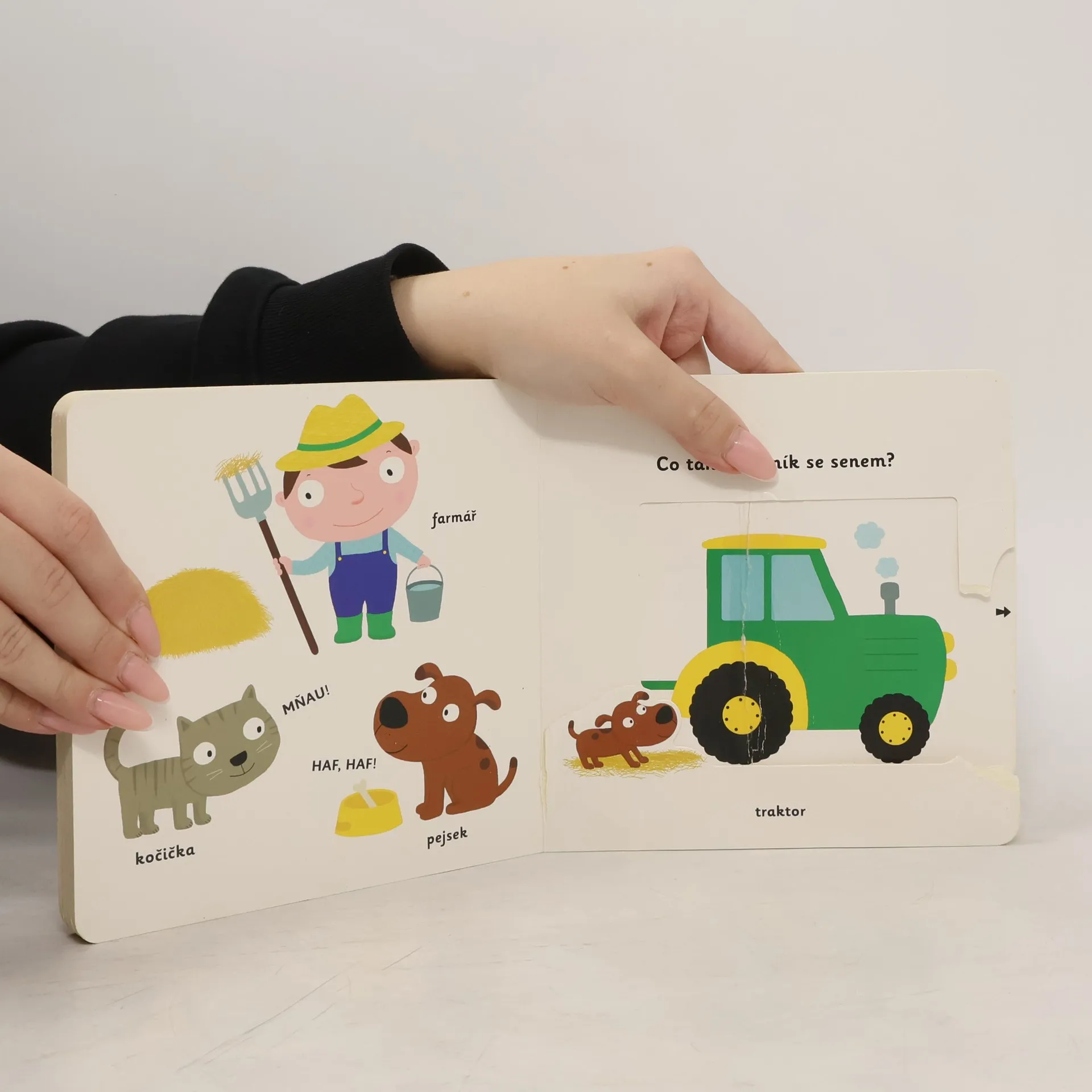 Objevovat svět na farmě s tímto leporelem je tak zábavné! Kdo každé ráno všechny budí? Kdo má legračně zakroucený ocásek? Kdo hopká a má dlouhé uši? Co táhne valník se senem? Stačí jen vložit prstík do správného otvoru a lehce vysunout, zatáhnout nebo otočit ve směru šipky a hned bude váš malý objevitel znát odpovědi. Leporelo je určeno pro nejmenší děti od jednoho roku a má pevné stránky s posuvnými a otočnými prvky, a tak si naši nejmenší mohou při prohlížení a rozeznávání zvířátek a věcí z farmy procvičit i jemnou motoriku.