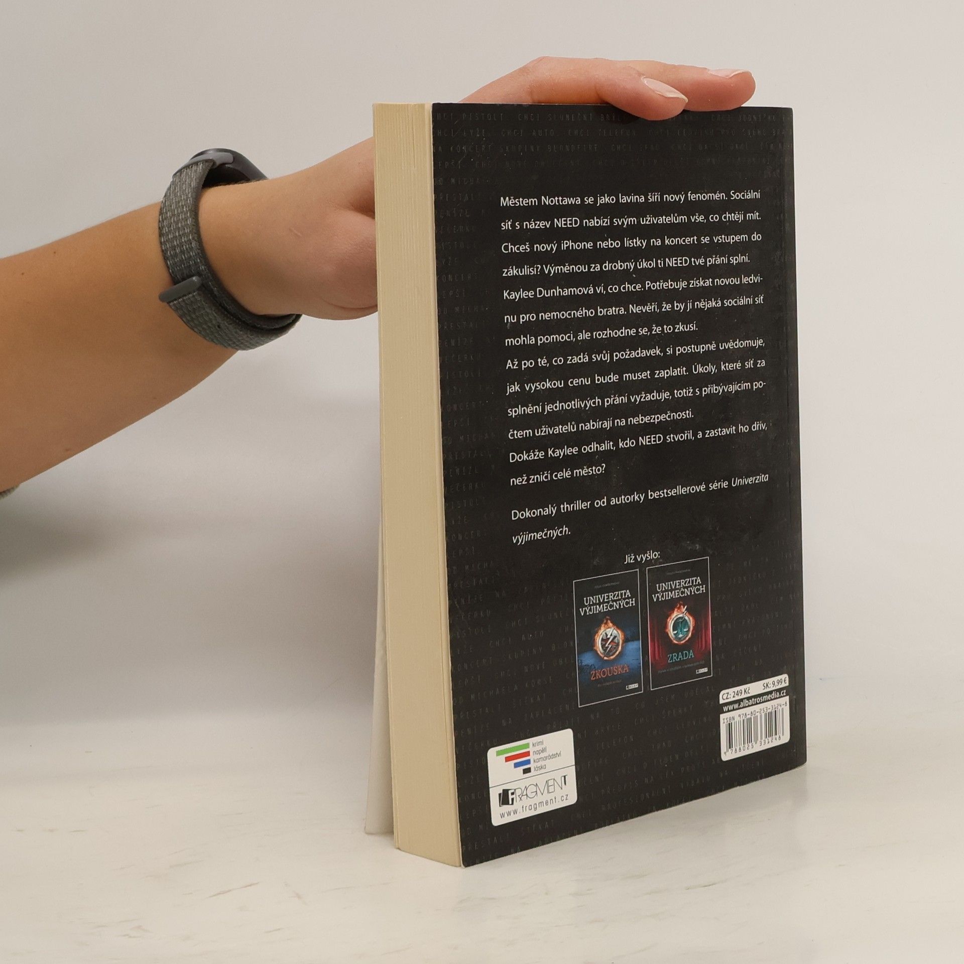 Městem Nottawa se jako lavina šíří nový fenomén. Sociální síť s názvem NEED nabízí svým uživatelům vše, co chtějí mít. Chceš nový iPhone nebo lístky na koncert se vstupem do zákulisí? Výměnou za drobný úkol ti NEED tvé přání splní. Kaylee Dunhamová ví, co chce. Potřebuje získat novou ledvinu pro nemocného bratra. Nevěří, že by jí nějaká sociální síť mohla pomoci, ale rozhodne se, že to zkusí. Až po té, co zadá svůj požadavek, si uvědomuje, jak vysokou cenu bude muset zaplatit. Úkoly, které síť za splnění jednotlivých přání vyžaduje, totiž s přibývajícím počtem uživatelů nabírají na nebezpečnosti. Dokáže Kaylee odhalit, kdo NEED stvořil, a zastavit ho dřív, než zničí celé město? Dokonalý thriller od autorky bestsellerové série Univerzita Výjimečných.