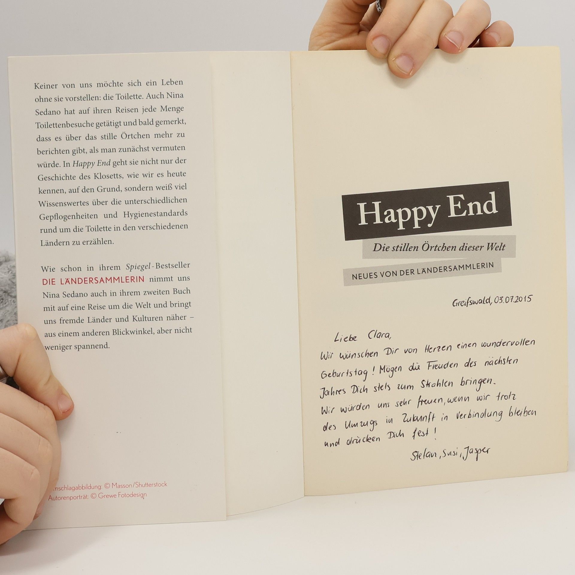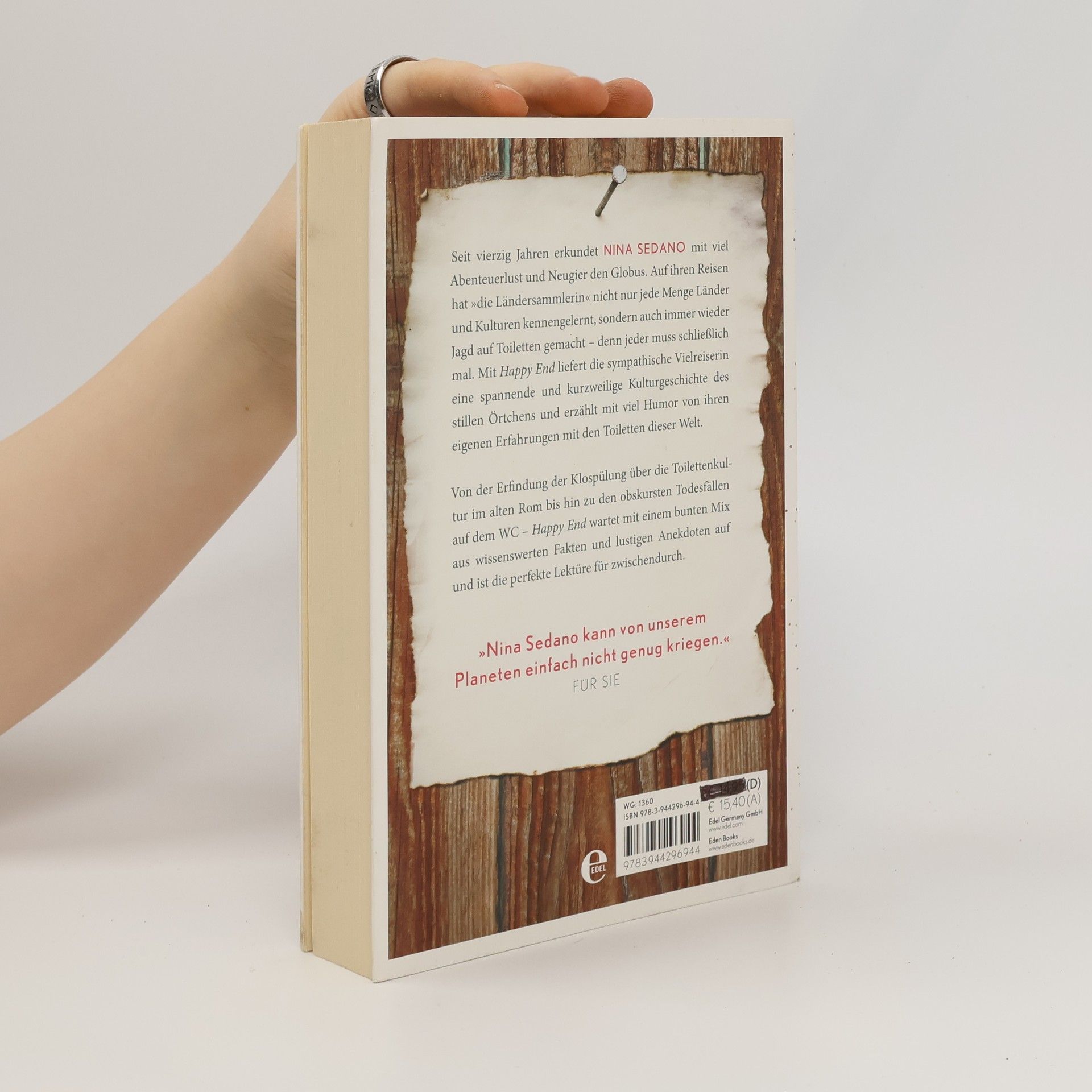 Seit vierzig Jahren erkundet NINA SEDANO mit viel Abenteuerlust und Neugier den Globus. Auf ihren Reisen hat »die Ländersammlerin« nicht nur jede Menge Länder und Kulturen kennengelernt, sondern auch immer wieder Jagd auf Toiletten gemacht – denn jeder muss schließlich mal. Mit Happy End liefert die sympathische Vielreiserin eine spannende und kurzweilige Kulturgeschichte des stillen Örtchens und erzählt mit viel Humor von ihren eigenen Erfahrungen mit den Toiletten dieser Welt. Von der Er ndung der Klospülung über die Toilettenkultur im alten Rom bis hin zu den obskursten Todesfällen auf dem WC – Happy End wartet mit einem bunten Mix aus wissenswerten Fakten und lustigen Anekdoten auf und ist die perfekte Lektüre für zwischendurch. »Nina Sedano kann von unserem Planeten einfach nicht genug kriegen.«