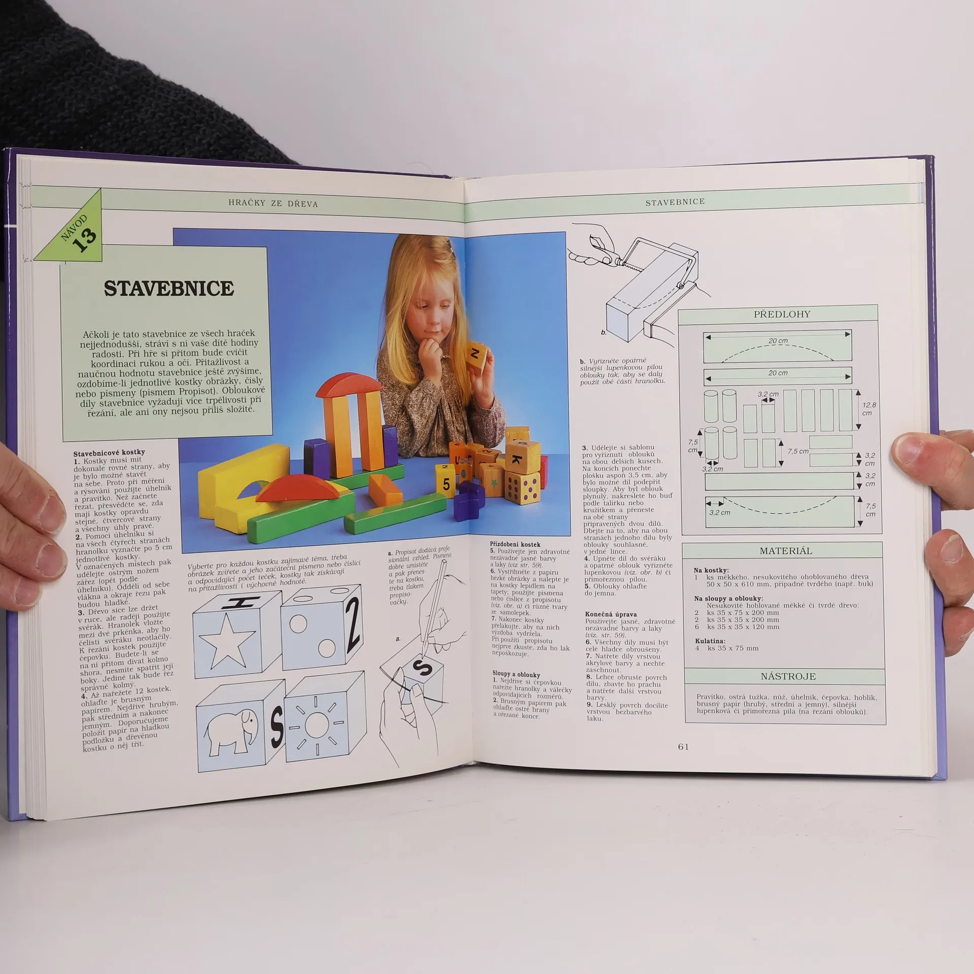 Kniha obsahuje 32 návodů na výrobu jednoduchých i složitějších hraček ze dřeva, textilu i jiných materiálů. Součástí výrobních postupů jsou podrobné nákresy a návody, spousta barevných i černobílých fotografií.
