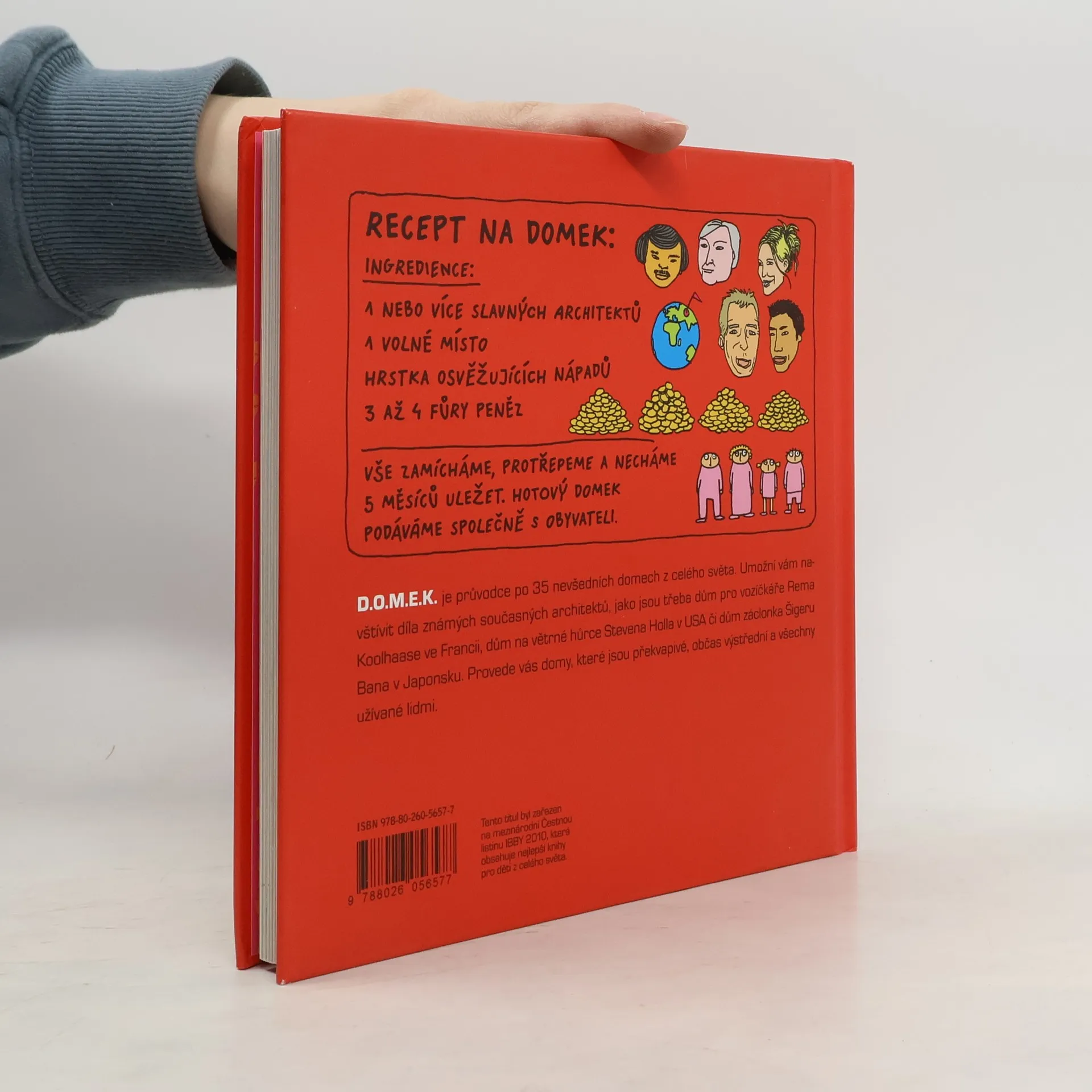 Knížka D.O.M.E.K. důvtipná obrázková mozaika efektních konstrukcí je průvodcem po 35 současných domech z celého světa. Domy v knížce zobrazené slouží různým účelům: v některých můžete bydlet, v některých jen přespat, v některých se pracuje a v některých pije čaj. Dozvíte se, kde ten který dům stojí, proč byl vymyšlený a postavený tak, jak byl, a kteří architekti ho navrhli. Všechno v knížce je kreslené. A kromě domů v ní uvidíte také spoustu zvířat, lidí, ufonů a příšerek a procestujete skoro celý svět. Knížka D.O.M.E.K. je určená dětem, jejich rodičům a prarodičům, kamarádům a kamarádkám.