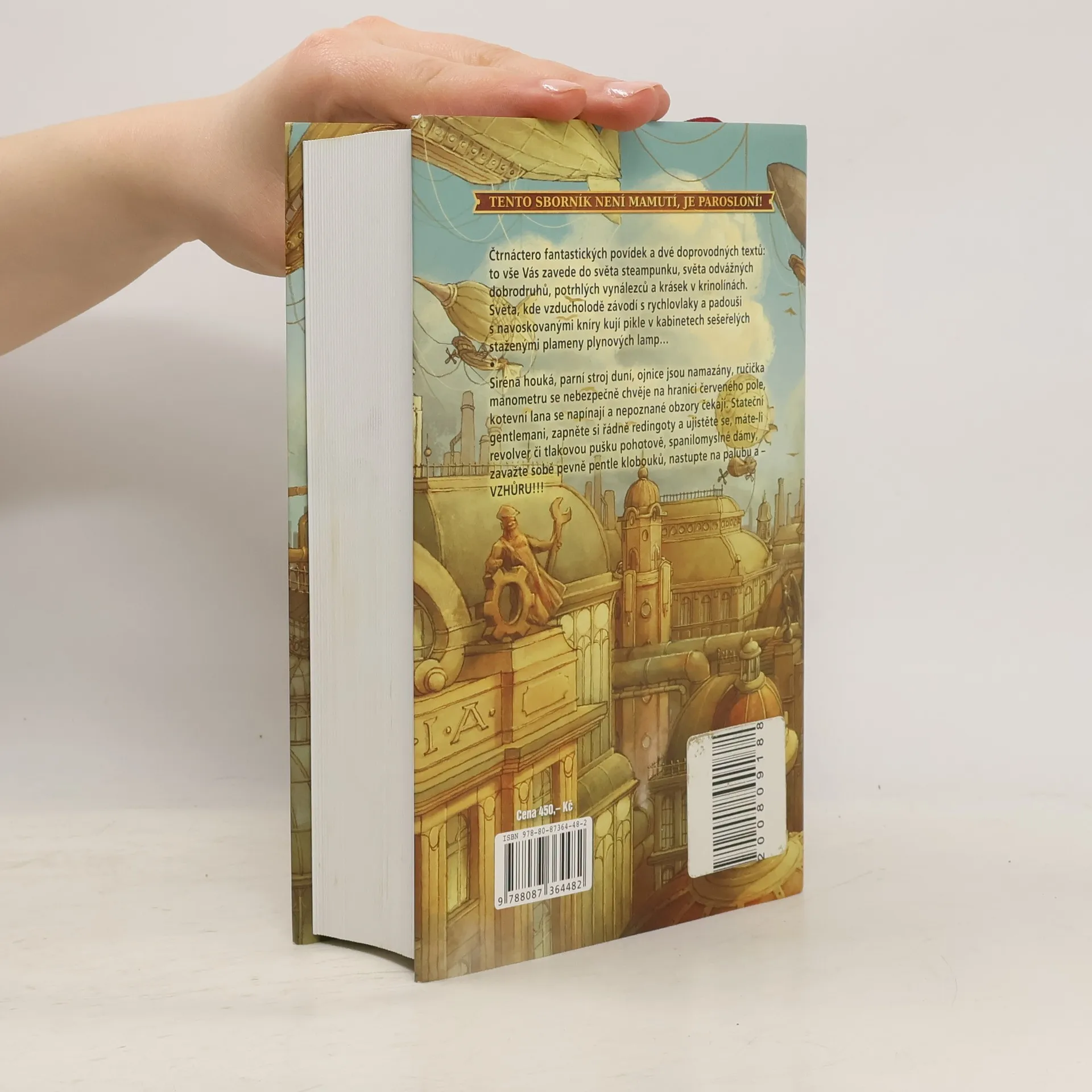 TENTO SBORNÍK NENÍ MAMUTÍ, JE PAROSLONÍ! Čtrnáctero fantastických povídek a dvé doprovodných textů: to vše Vás zavede do světa steampunku, světa odvážných dobrodruhů, potrhlých vynálezců a krásek v krinolínách. Světa, kde vzducholodě závodí s rychlovlaky a padouši s navoskovanými kníry kují pikle v kabinetech sešeřelých staženými plameny plynových lamp… Siréna houká, parní stroj duní, ojnice jsou namazány, ručička manometru se nebezpečně chvěje na hranici červeného pole, kotevní lana se napínají a nepoznané obzory čekají. Stateční gentlemani, zapněte si řádně redingoty a ujistěte se, máte-li revolver či tlakovou pušku pohotově, spanilomyslné dámy, zavažte sobě pevně pentle klobouků, nastupte na palubu a – VZHŮRU!!!
