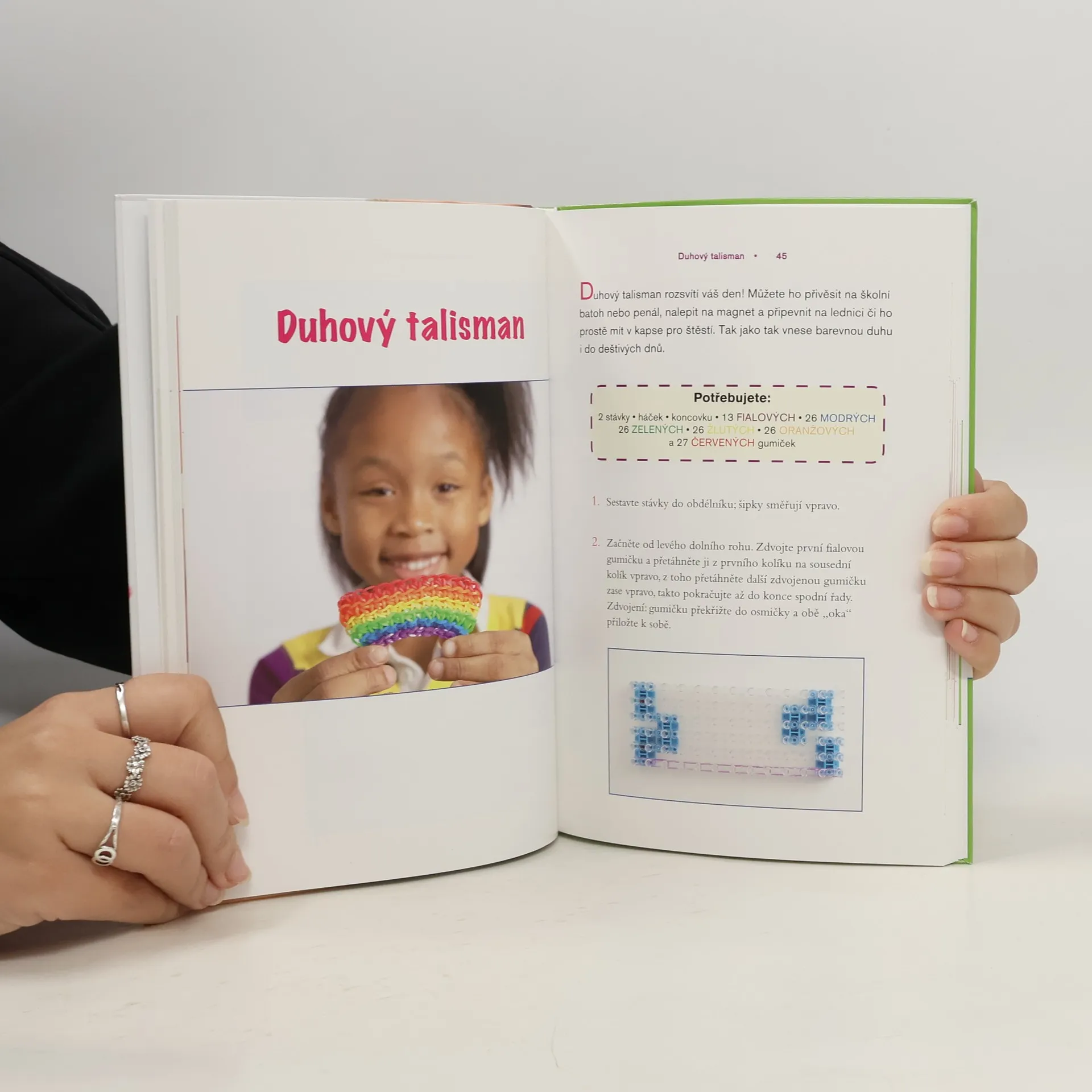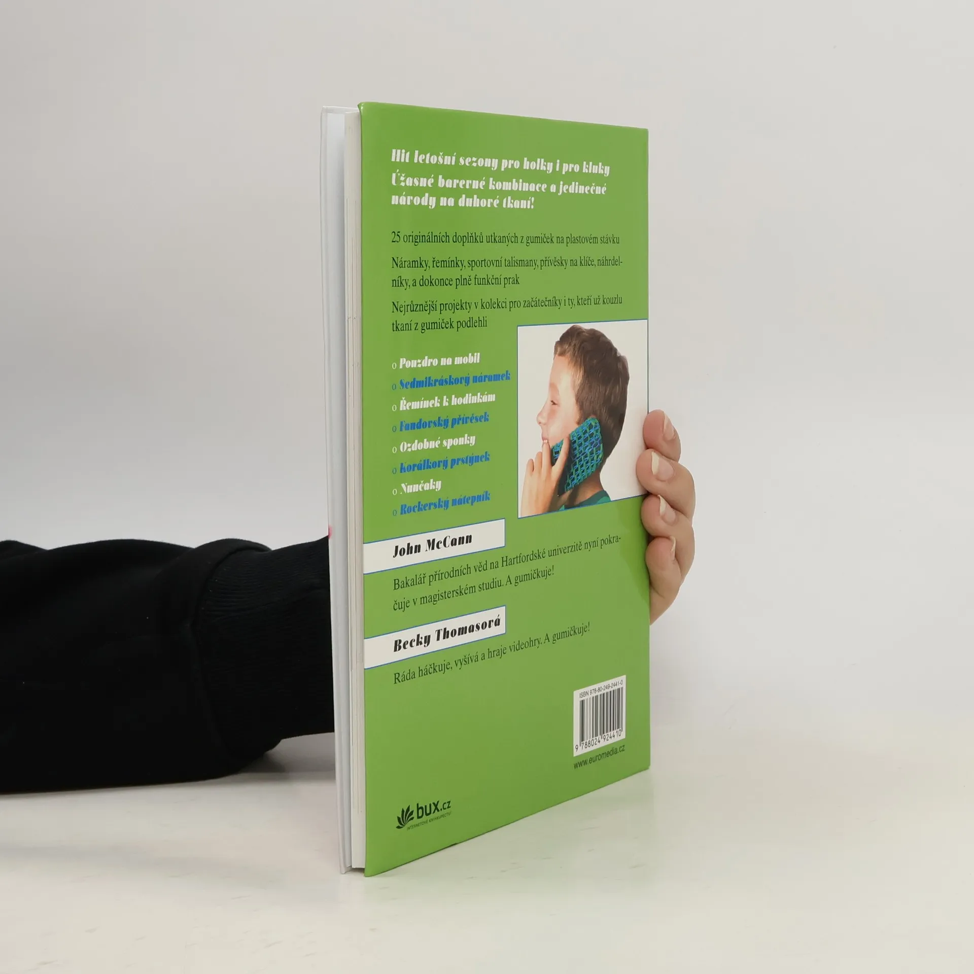 25 senzačních návrhů na duhové tkaní z gumiček Hit letošní sezony pro holky i pro kluky! Budete potřebovat jen stávek, kupu barevných gumiček, háček, trochu zručnosti a hodně fantazie. Pak se můžete pustit do zábavného duhového tkaní! Vyberte si z 25 nápaditých projektů: jsou mezi nimi náramky, sportovní talismany, přívěsky na klíče, náhrdelníky, pouzdro na mobil, rockerský nátepník, a dokonce i plně funkční prak. Podlehněte kouzlu tkaní z gumiček a přidejte nové výrazné doplňky ke svému outfitu!