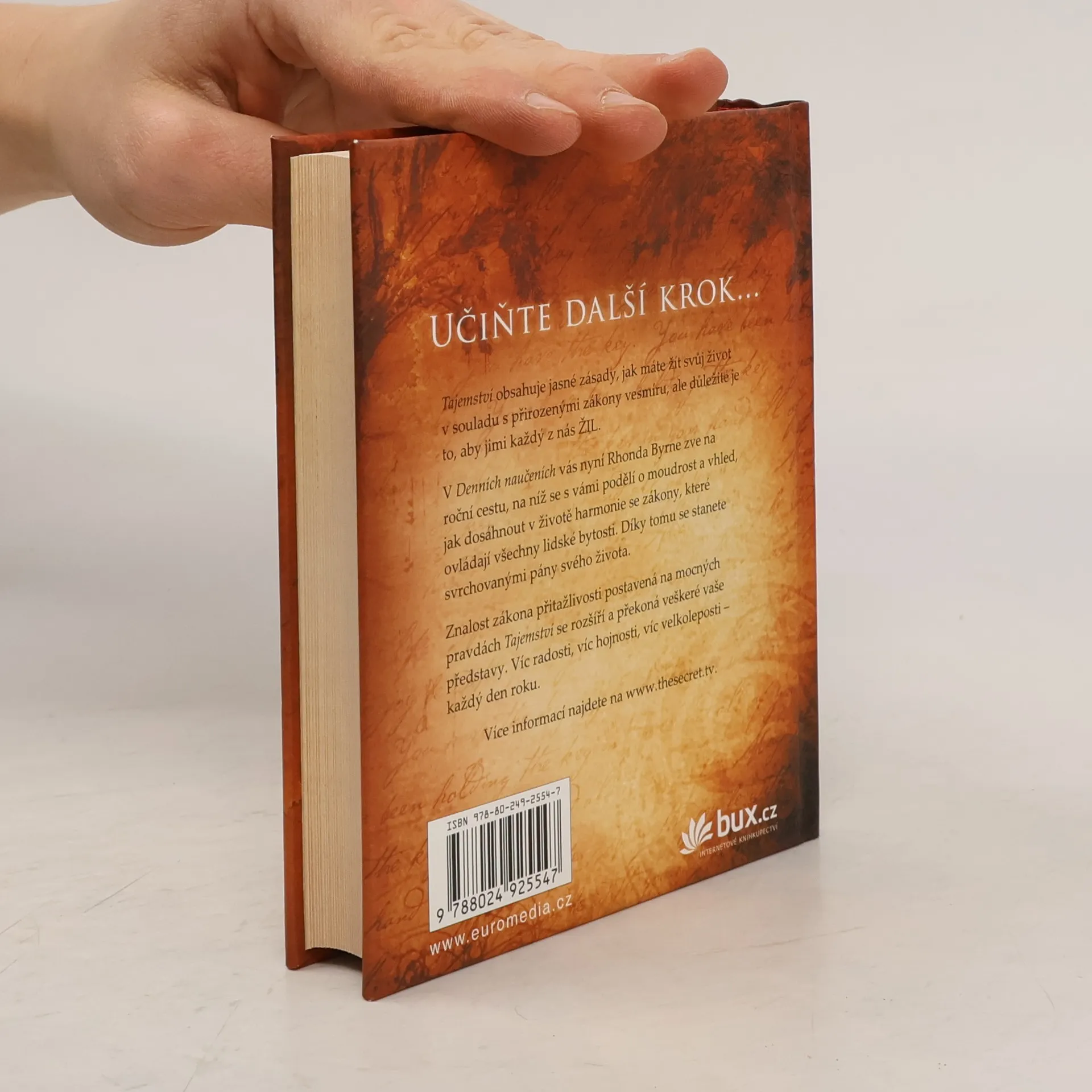 Tajemství obsahuje jasné zásady, jak vést život v souladu s přirozenými zákony vesmíru, ale hlavně jimi musíte skutečně ŽÍT. S Denním naučením vás Rhonda Byrne provede rokem učení a podělí se s vámi o moudrost i vhled, jak dosáhnout harmonie se zákony, které ovládají všechny lidské bytosti. Stanete se pány svého osudu. Mocné pravdy Tajemství tvoří pevné základy, na nichž vybudujete rozšířenou znalost zákona přitažlivosti. Víc radosti, víc hojnosti, víc velkoleposti – každý den po celý rok.