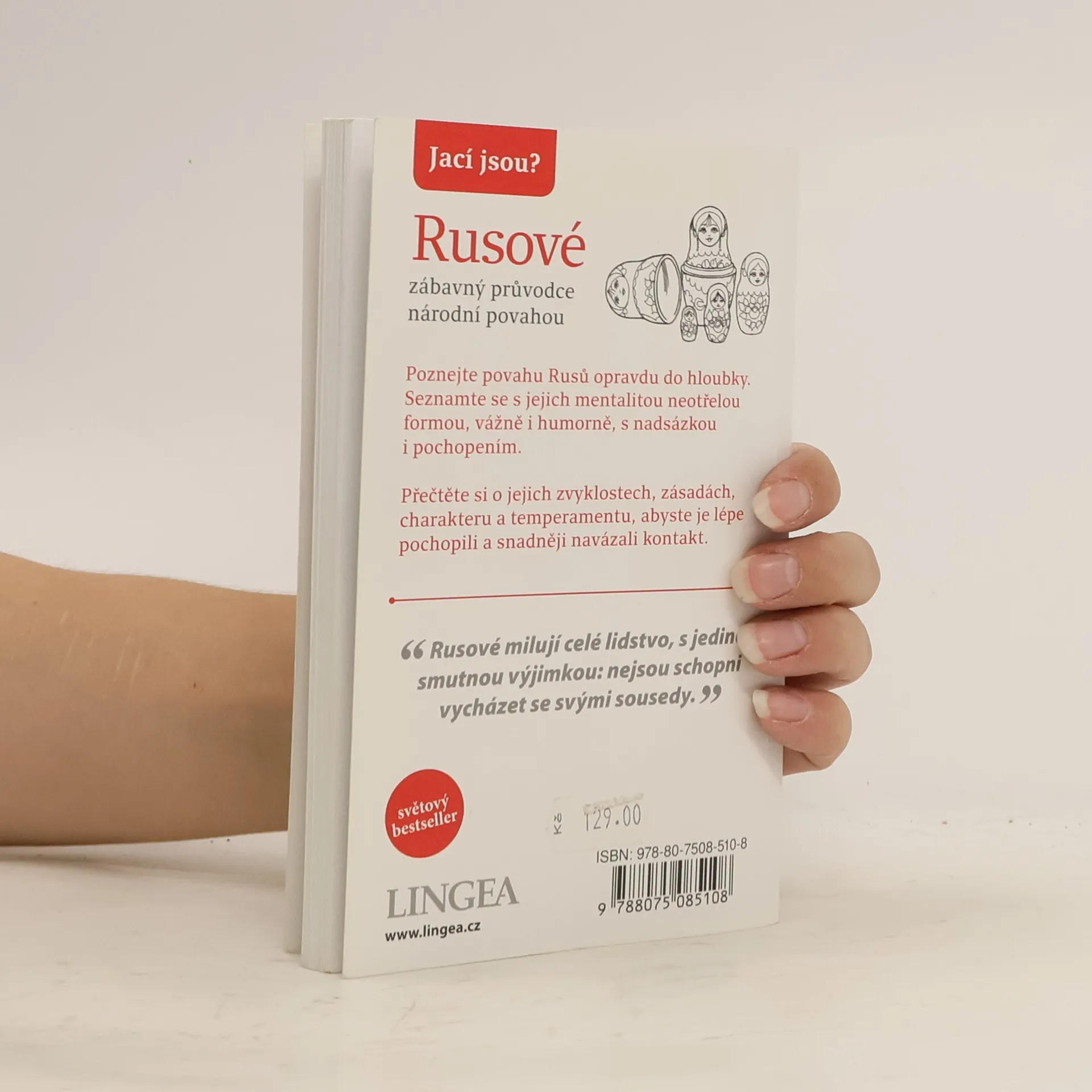 Zábavný průvodce ruskou povahou popisuje současný ruský životní styl a odhaluje, jací Rusové skutečně jsou. Dozvíte se, proč milují davy, jak slaví svátky, jaký mají smysl pro humor a jak fungují rodinné tradice, školství, kultura a státní správa. Kniha přispívá k pochopení ruského vlastenectví, pospolitosti a sentimentality, což usnadňuje navazování kontaktů. Ruský charakter je plný rozporů; fatalismus je jedním z jeho rysů. Rusové věří, že po dobrém přichází zlé, a naopak, což je dáno osudem. Potřeba pospolitosti je pro ně klíčová, a jejich láska k bližnímu je silná, což jim pomáhá přežít těžké historické chvíle. V těžkostech se v nich probouzí romantik, který doufá v lepší zítřky. Vodka, národní nápoj, se dokonce používá jako měna a je nezbytná při návštěvách ruských domácností. Sledování populárních televizních seriálů je další národní vášní, která dokáže na chvíli odvrátit pozornost od zločinnosti. Kniha nabízí mnoho zajímavostí, psaných vážně i s nadsázkou, a pomáhá lépe porozumět ruské kultuře a tradicím.