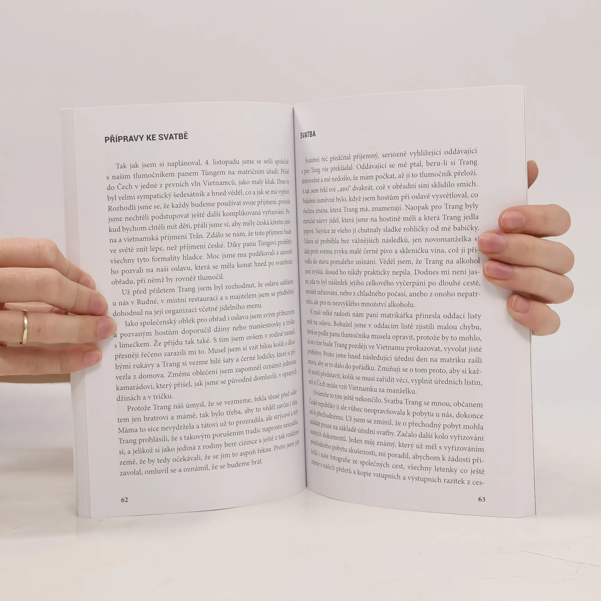 Kniha vypráví příběh o společném životě občana České republiky s občankou Vietnamské socialistické republiky. O přátelství a lásce dvou lidí, kteří se přes propastnou odlišnost svých kultur rozhodli pro společný život. Začíná jejich seznámením v recepci hanojského hotelu. Popisuje potíže, které museli překonat, aby legalizovali svůj vztah. Mimo to, že vás kniha provede krásnou vietnamskou krajinou, zúčastníte se oslav jejich druhé svatby ve Vietnamu a seznámíte se s rodinnými vztahy Vietnamců i s jejich osobitými zvyky. Příběh obou manželů vás určitě donutí k zamyšlení, že se všechno dá zvládnout, když si dva přejí spolu žít a také určitě přispěje k lepšímu porozumění životu a zvykům lidí, kteří u nás tvoří jednu z nejpočetnějších národnostních menšin.