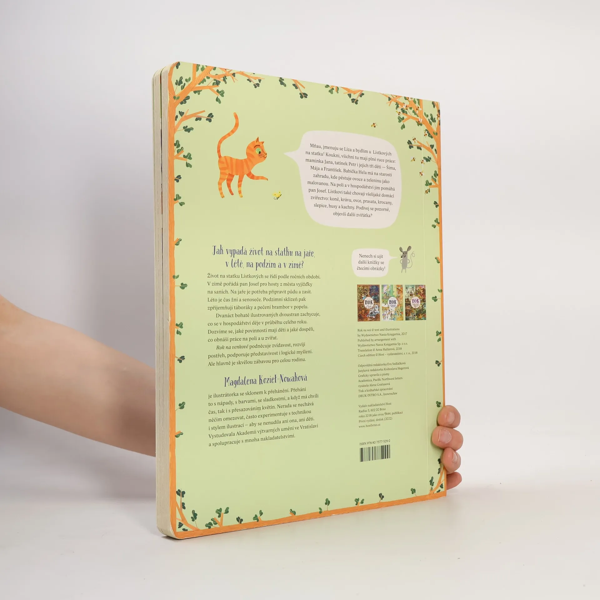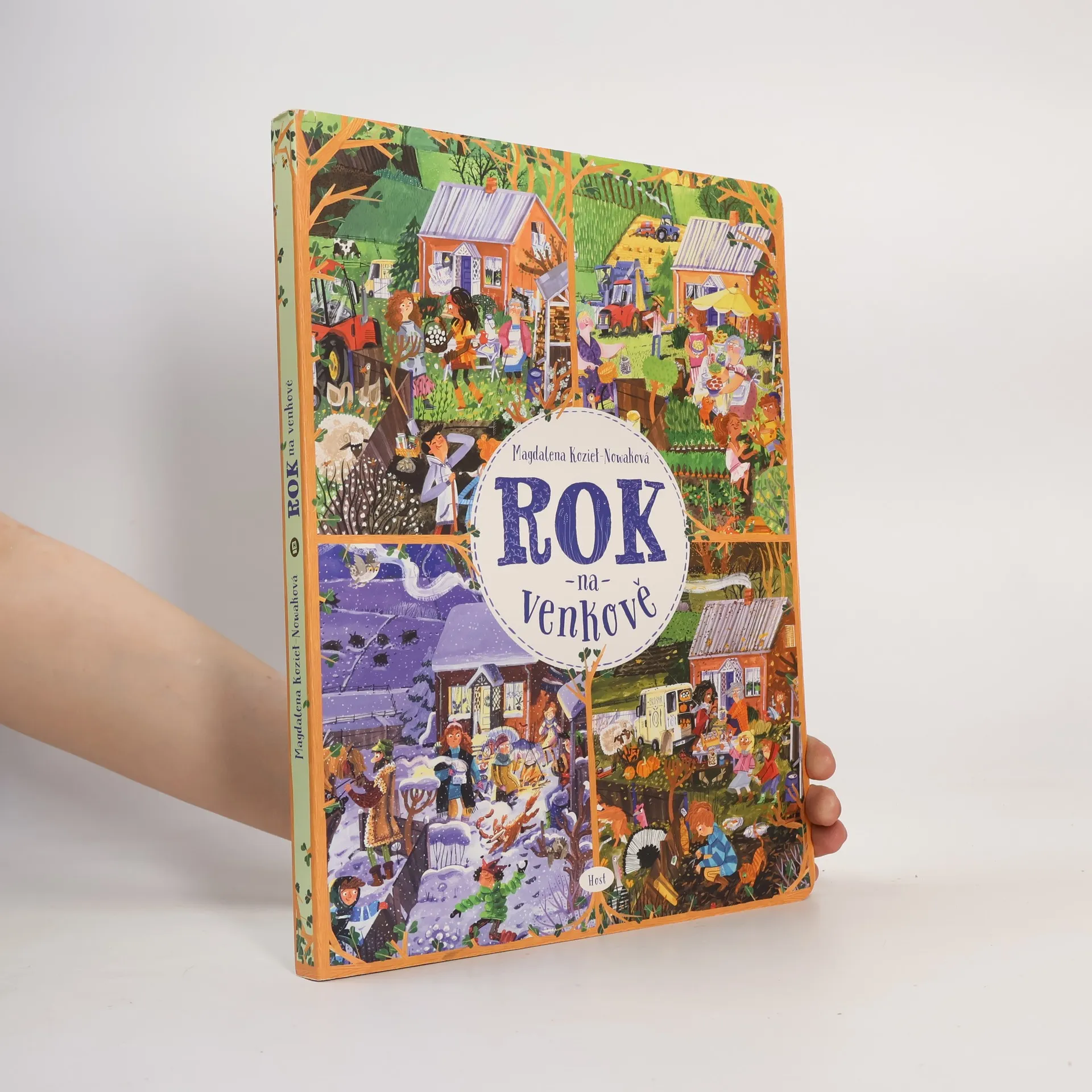 Život na statku Lístkových se řídí podle ročních období. V zimě pořádá pan Josef pro hosty z města vyjížďky na saních. Na jaře je potřeba připravit půdu a zasít. Léto je čas žní a senoseče. Podzimní sklizeň pak zpříjemňují táboráky a pečení brambor v popelu. Dvanáct bohatě ilustrovaných dvoustran zachycuje, co se v hospodářství děje v průběhu celého roku. Dozvíme se, jaké povinnosti mají děti a jaké dospělí, co obnáší práce na poli a u zvířat. Rok na venkově podněcuje zvídavost, rozvíjí postřeh, podporuje představivost i logické myšlení. Ale hlavně je skvělou zábavou pro celou rodinu. Pro děti od dvou let.