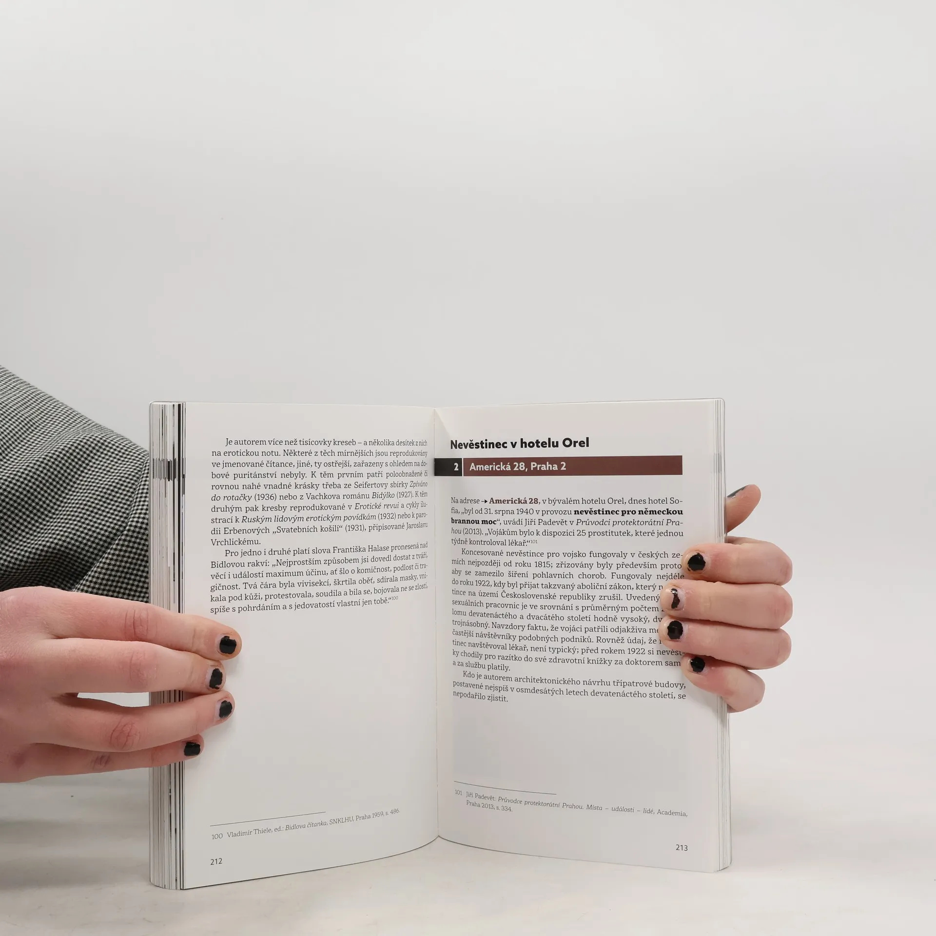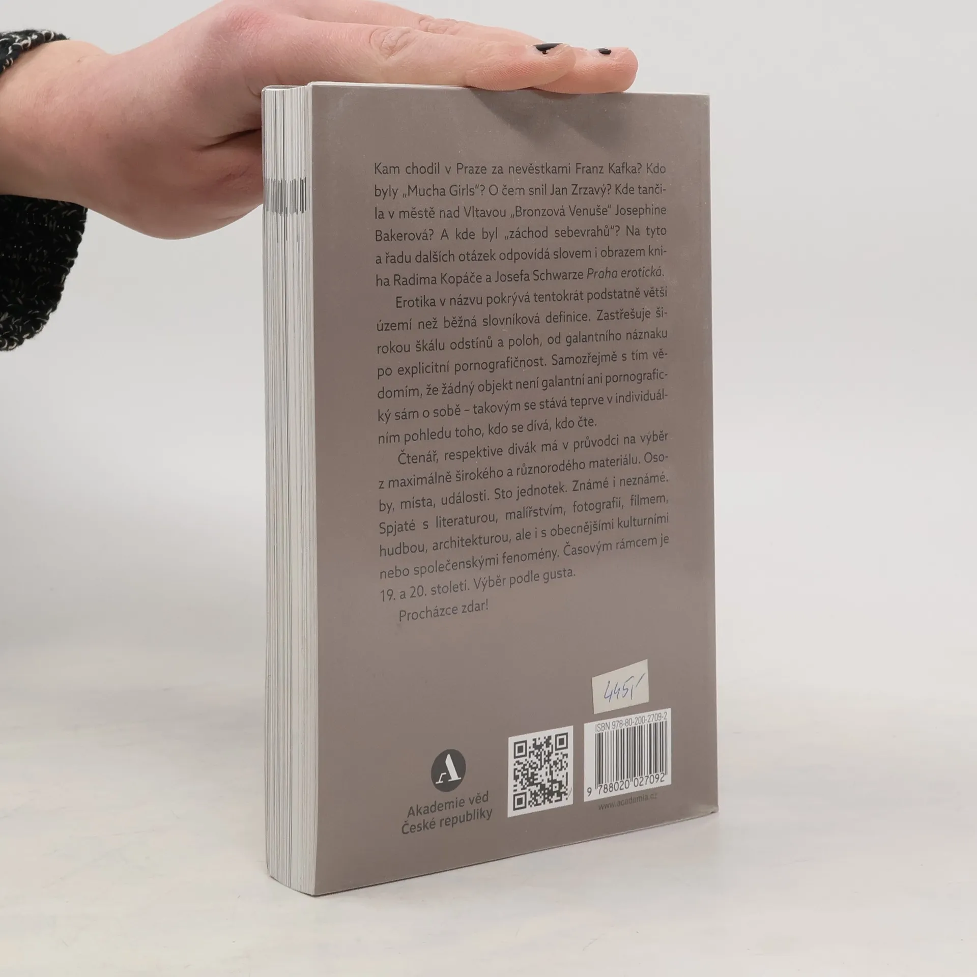 Kam chodil v Praze za nevěstkami Franz Kafka? Kdo byly „Mucha Girls“? O čem snil Jan Zrzavý? Kde tančila v městě nad Vltavou „Bronzová Venuše“ Josephine Bakerová? A kde byl „záchod sebevrahů“? Na tyto a řadu dalších otázek odpovídá slovem i obrazem kniha Radima Kopáče a Josefa Schwarze "Praha erotická". Publikace představuje sto vybraných míst hlavního města v souvislosti s erotickým, obecněji sexuálním životem Pražanů zejména ve 20. století. Prochází jednotlivé městské čtvrti s důrazem na architektonické prvky a sochy ve veřejném prostoru, na lokality, kde žili nebo provozovali svoji živnost vydavatelé a autoři erotické literatury, ale i malíři, fotografové, filmaři, herci a zpěváci, případně různí popularizátoři, osvětáři a sběratelé, u nichž se objevovaly erotické motivy, a na instituce nejrůznějším způsobem spojené s tematikou lidské sexuality. Publikace přináší vedle úvodu a průvodních textů k jednotlivým zastavením četné ukázky z krásné i odborné literatury a bohatý ilustrační materiál.