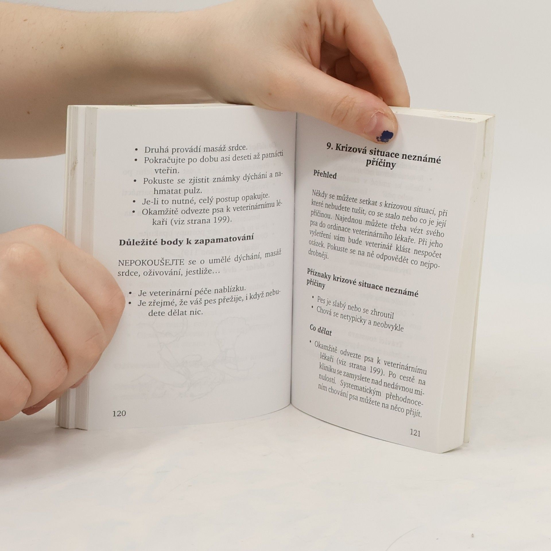 Praktické rady, týkající se preventivní medicíny, výživy, cizopasníků, rozmnožování, starších psů, cestování se psem aj. Zvláštní pozornost je věnována zásadám první pomoci, oživování, autonehodám, zlomeninám, ranám, popáleninám, úrazům elektrickým proudem, přehřátí, podchlazení, dušení, otravám, záchvatům a dalším problémům. Autor se věnuje i odvozu k veterinárnímu lékaři, následné péči, jako je třeba podávání léků, rehabilitace a pod. Vzhledem ke kapesnímu formátu je knihu možné brát kdykoliv kamkoliv s sebou.