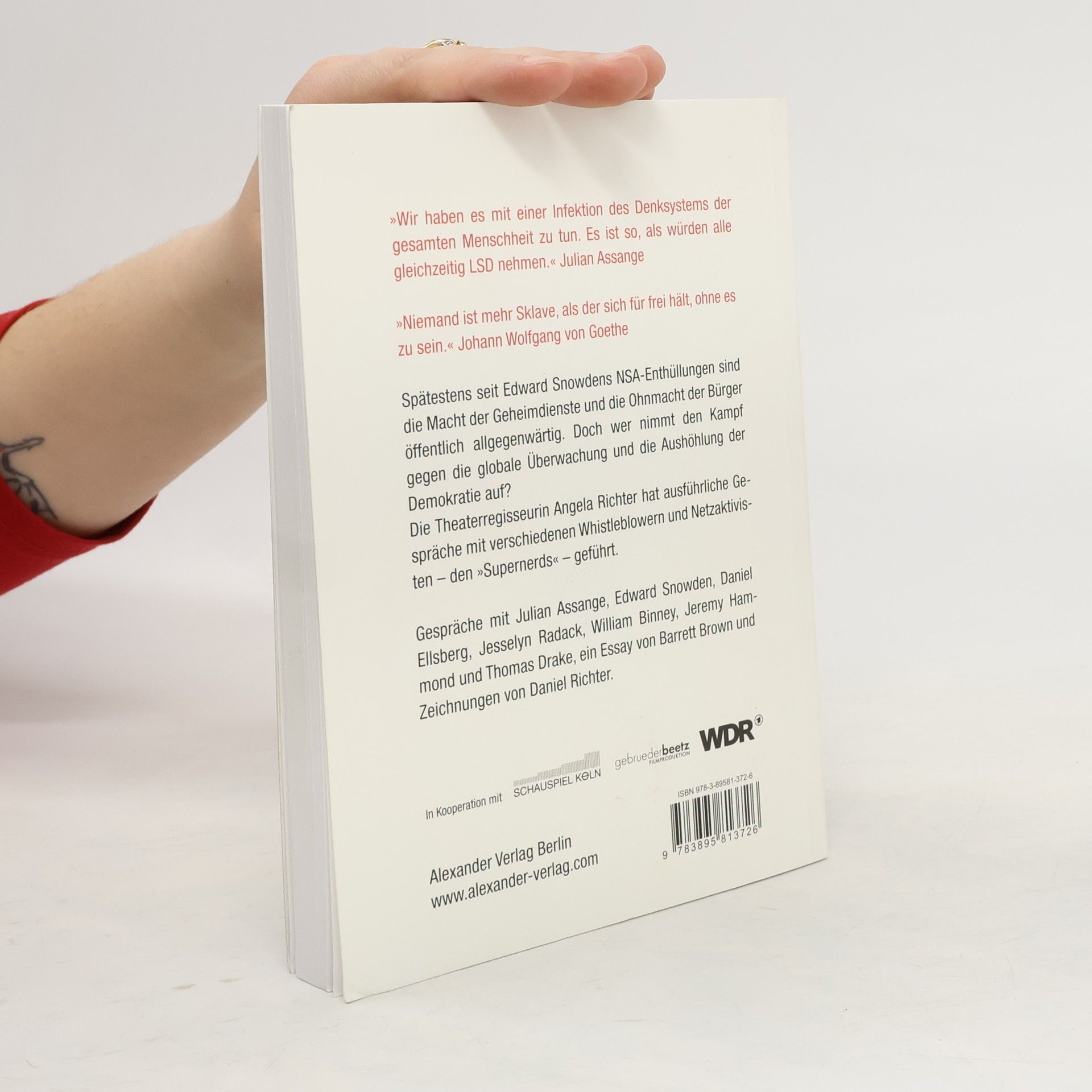 'Whistleblower, Internetaktivisten, Coder, Cyberpunks, Geeks. Es sind die Nerds, die derzeit die Kultur der Welt bewegen. Sie haben uns die Augen geöffnet, uns aufgeklärt im besten und wörtlichsten Sinne eines westlichen Wertesystems.' Angela Richter Für ihr neues Projekt „Die Avantgarde der Supernerds“ hat die Theaterregisseurin Angela Richter ausführliche Interviews mit den Whistleblowern und Netzaktivisten Julian Assange, Edward Snowden, Daniel Ellsberg (Pentagon Papers), Jesselyn Radack, William Binney und Thomas Drake geführt. Diese Gespräche sind Auseinandersetzungen nicht nur mit der Gefährdung der Demokratie durch die Geheimdienste, dem wachsenden Überwachungsapparat und den zunehmenden Verletzungen der Pressefreiheit in den USA, sondern auch sehr persönliche Gespräche über das eigene Schicksal, den Kampf gegen eine Staatsmacht, die Pflicht zum Verrat. Parallel zu Angela Richters Theaterprojekt erscheinen die Gespräche erstmals in deutscher Sprache. „Die Avantgarde der Supernerds“ hat am 28. Mai 2015 am Schauspiel Köln Premiere und wird gleichzeitig im WDR im Rahmen einer Sondersendung live übertragen. Dazu entsteht ein Dokumentarfilm, der anschließend ausgestrahlt wird.